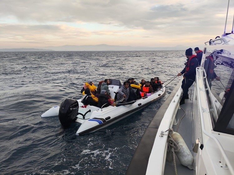 Sahil Güvenlik Komutanlığı ekipleri, 16 Ocak günü saat 09.25’te, Seferihisar ilçesi açıklarında görevli Sahil Güvenlik Botu (KB-89) tarafından tespit edilen hareketli fiber karinalı lastik botu durdurdu. Lastik bot içerisindeki 13’ü çocuk 32 göçmen ve 1 göçmen kaçakçısı şüphelisi yakalandı.