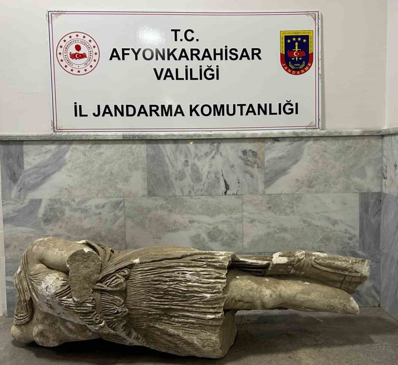 Afyonkarahisar’da jandarma ekipleri 2 şahsı ellerinde bulunan ve Roma dönemine ait olduğu değerlendirilen 1.5 metre uzunluğundaki heykeli satmak isterken yakaladı.