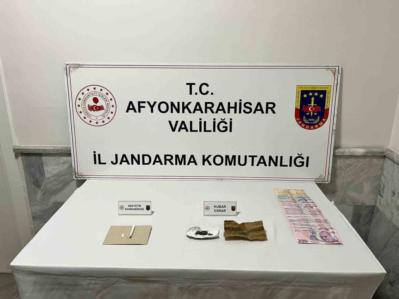 Edinilen bilgilere göre, Afyonkarahisar İl Jandarma Komutanlığına bağlı ekipleri aldıkları ihbar üzerine harekete geçti. Ekipler içerisinde 5 kişinin bulunduğu aracı takibe aldı. Ardından aracı durdurarak arama yaptı. Aramada 4 içimlik sentetik kannobinoid maddesi, 1 adet makas, 2.91 gram esrar maddesi, 1 adet sigara içerisinde içime hazır kannobinoid maddesi ve suçtan elde edildiği değerlendirilen 4 bin Türk Lirası ele geçirdi. Olay sonrası araçta bulunan U.Y., Y.Y., M.S.K., A.Y. ve A.Ö. isimli şahısların gözaltına alındığı bildirildi.