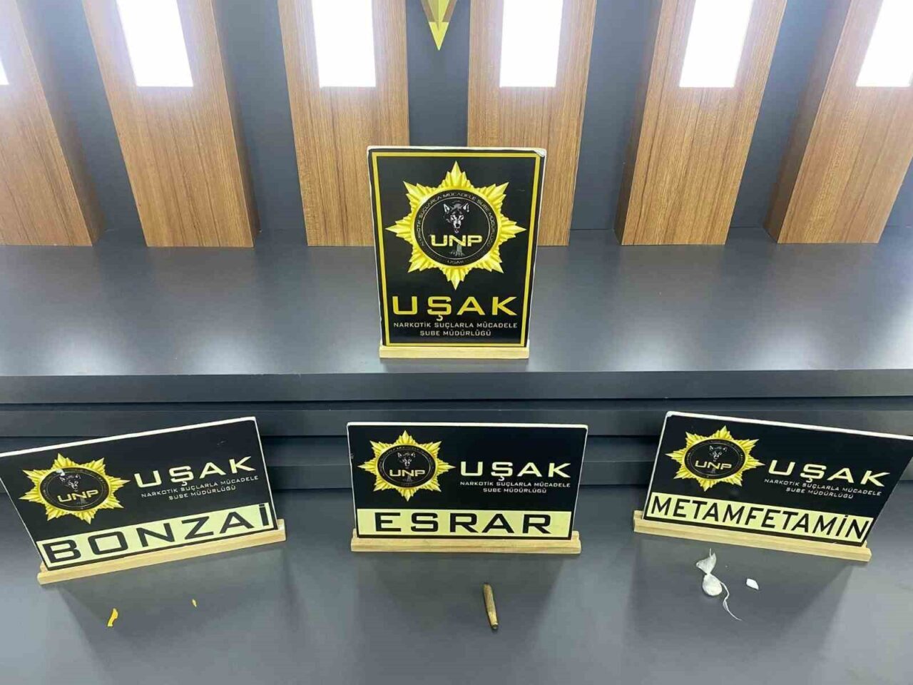 Uşak’ta yapılan operasyonlarda 1 kilo 802 gram metamfetamin, 211 adet kullanımlık A4 sentetik bonzai, bir miktar esrar ve 1 adet hassas terazi ele geçirildi.