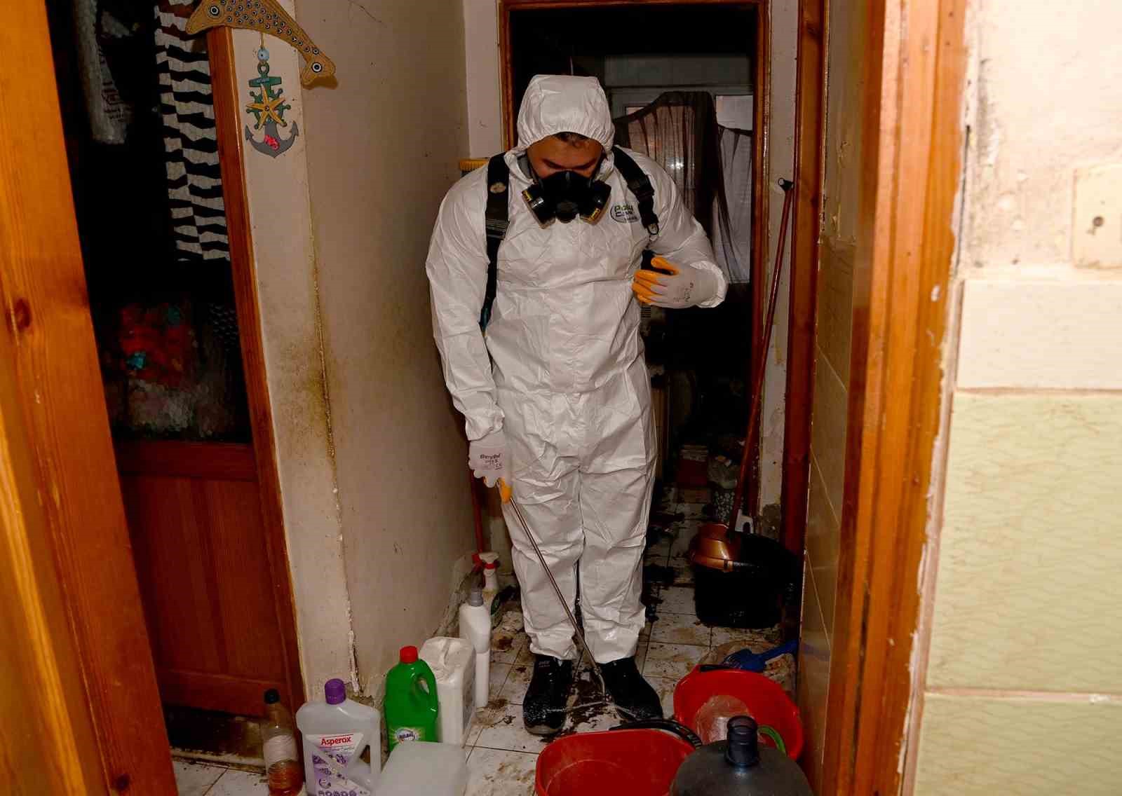 Türkmen Mahallesi’nde 4 katlı bir apartmandan gelen kötü kokular üzerine çevre sakinleri durumu Kuşadası Belediyesi’ne bildirdi. İhbar üzerine adrese zabıta ve Temizlik İşleri Müdürlüğü ekipleri sevk edildi. Kötü kokunun zemin kattaki daireden geldiği belirlendi. Evde yaşayan Serap Ö., ekiplerin ikna çabaları sonucu kapıyı açtı. Eşi yaklaşık 2 ay önce organ yetmezliğinden ölen kadının evinden 4 kamyon çöp ile atık çıkartıldı. Toplanan çöp ve atıklar imha için belediyenin Yaylaköy Mahallesi’ndeki atık toplama alanına götürüldü. Sıcak suyla yıkanıp temizlenen ev, bit, pire ve haşerelere karşı da ilaçlanırken, apartman sakinleri Kuşadası Belediyesi ekiplerine teşekkür etti.