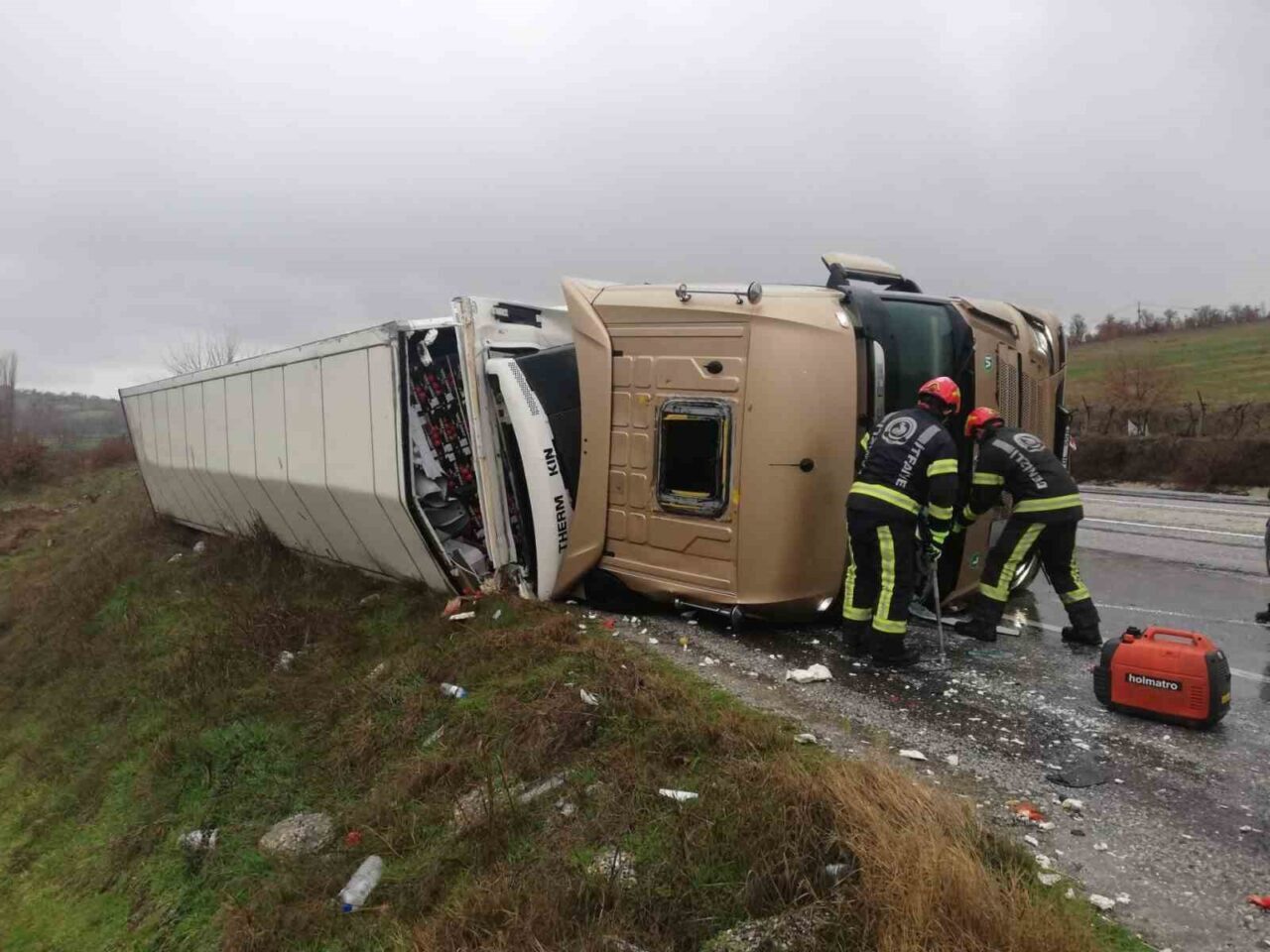 Kısa sürede olay yerine gelen itfaiye ekipleri, devrilen tırda mahsur kalan yaralıyı ön camı kırarak çıkarıp sağlık ekiplerine teslim etti. Sağlık ekipleri sürücüye olay yerinde ilk müdahaleleri yaptıktan sonra ambulans ile hastaneye sevk etti. Hastaneye sevk edilen yaralının durumu iyi olduğu öğrenildi.