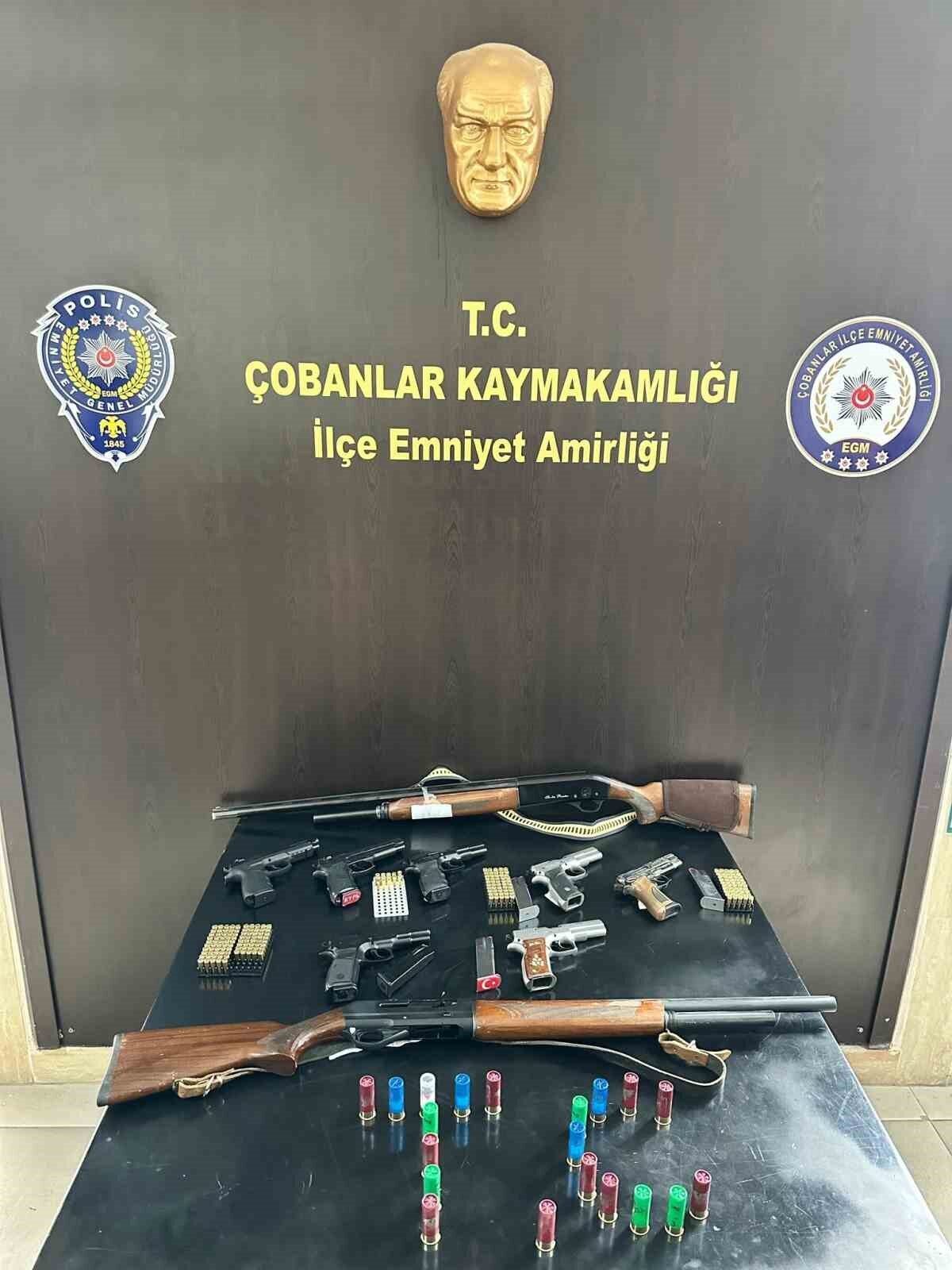İl Emniyet Müdürlüğü koordinesinde Çobanlar İlçe Emniyet Amirliğince düğün ve eğlencelerde tabanca ve tüfeklerle havaya ateş açtıkları belirlenen şahısların adreslerine operasyon düzenlendi. Ekipler dron destekli operasyonda 13 kişiyi gözaltına aldı. Yapılan aramalarda 5 adet bulundurma ruhsatlı tabanca, kurusıkıdan bozma tabanca, kurusıkı tabanca, 2 ruhsatsız av tüfeği ve bu silahlara ait 250’ye yakın mermi ele geçirildi. Şüphelilerin işlemlerinin ardından adliyeye sevk edilecekleri bildirildi.