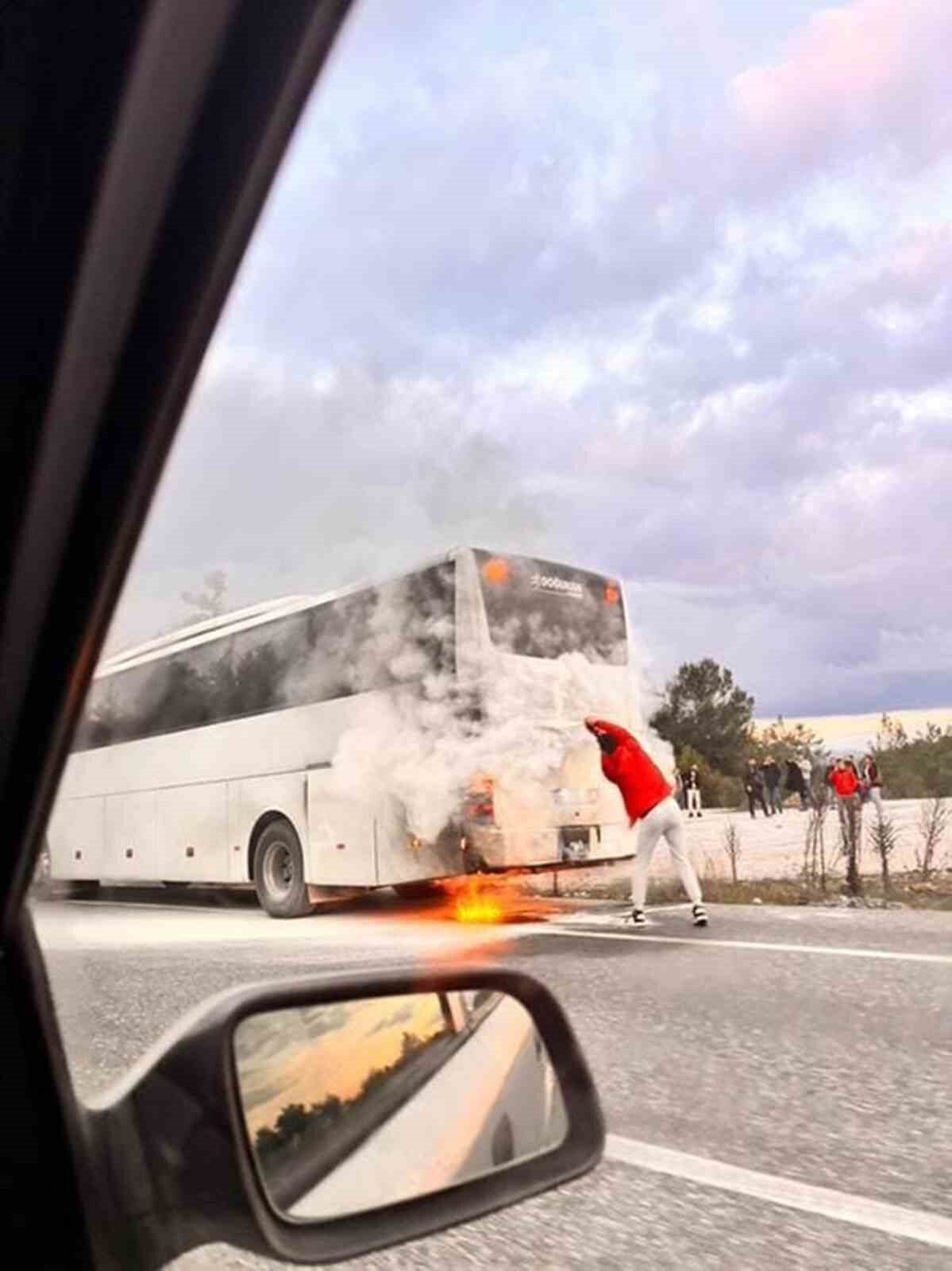 Muğla’da hareket halindeki otobüs motor bölümünde başlayan yangın sonrası yol trafiğe kısa süreliğine kapatıldı.