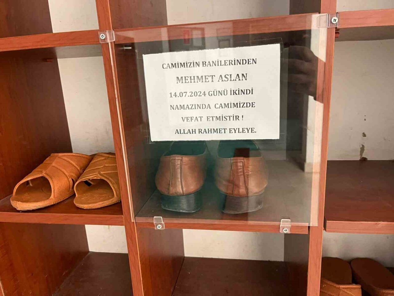 Ayakkabının muhafaza altına alındığı ayakkabılığa, “Camimizin banilerinden Mehmet Aslan 14.07.2024 günü ikindi namazında camimizde vefat etmiştir. Allah rahmet eyleye” notu yazıldı.