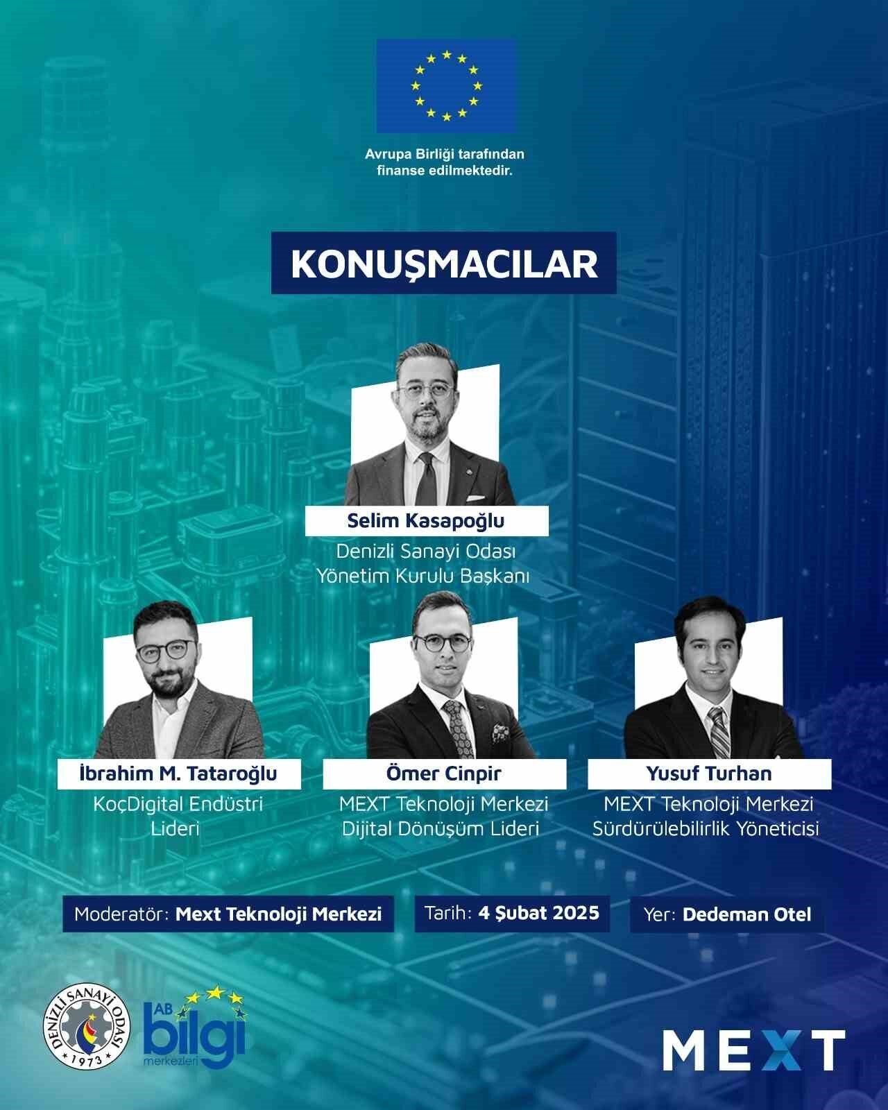 Denizli Avrupa Birliği Bilgi Merkezi koordinasyonunda, DSO Bilişim Komisyonu ortaklığı, MEXT Teknoloji Merkezi iş birliği ve AB Türkiye Delegasyonu desteği ile “Avrupa Birliği Perspektifinde Dijital ve Yeşil Dönüşüm Çalıştayı” 4 Şubat 2025 Salı günü saat 09.30’da Denizli Dedeman Otel’de gerçekleştirilecek.
