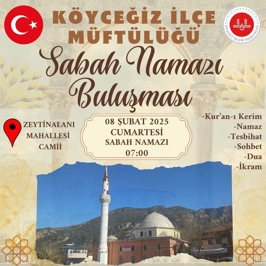 Muğla’nın Köyceğiz ilçesinde bu hafta Sabah Namazı buluşması Zeytinalanı Mahallesi Merkez Camii’nde gerçekleşecek.