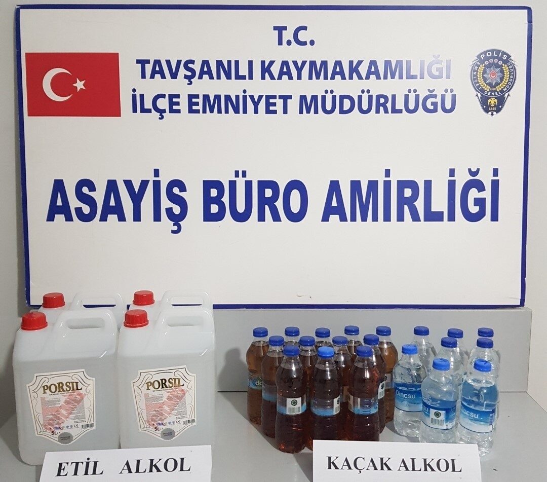 Tavşanlı İlçe Emniyet Müdürlüğü ve KOM Şube Müdürlüğü ekiplerinin Tavşanlı ilçesinde kaçak alkol yapımını ve satışını önlemek amacıyla yaptıkları müşterek çalışmalar sonucu bir kargo firması aracılığıyla Tekirdağ’dan, Tavşanlı’ da ikamet eden H.İ.G isimli şahsa kaçak alkol yapımında kullanılan etil alkol maddesinin gelebileceği bilgisi üzerine, kargo teslimi sonrası Tavşanlı İlçe Emniyet Müdürlüğü ekiplerince şüpheli şahıs yakalanarak teslim aldığı koliye el konuldu. Koli içerisinde yapılan aramada, 4 adet 5 litrelik toplamda 20 litre olan kaçak alkol yapımında kullanılan etil alkol, şüpheli H.İ.G isimli şahsın ikametinde yapılan aramada ise, satışa hazır 0.5 litrelik 8 adet pet şişe içerisine hazırlanmış toplamda el yapımı 4 litre votka ve 0.5 litrelik 12 adet pet şişe içerisine hazırlanmış toplamda 6 litre viski ele geçirildi.