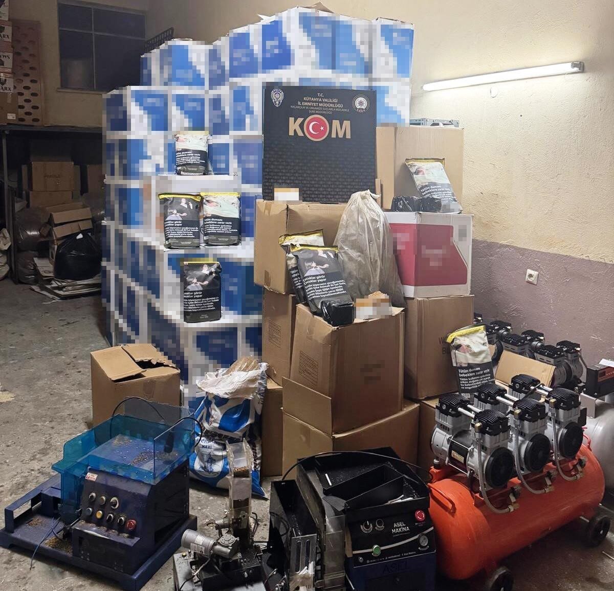 Kütahya KOM Şube Müdürlüğü ekiplerince kaçakçılık suçunun önlenmesine yönelik olarak yapılan çalışmalar çerçevesinde Kütahya il merkezinde 1 ikamet, Gediz ilçesinde 2 ikamet, 1 işyeri ve 1 araçta eş zamanlı olarak yapılan arama sonucunda, 1 milyon 634 bin 520 adet dolu ve boş makaron,133 kilogram kıyılmış tütün, 3 adet elektronik makaron doldurma makinası, 1 adet hava kompresörü,1 adet tabanca ve 2 fişek ele geçirildi.