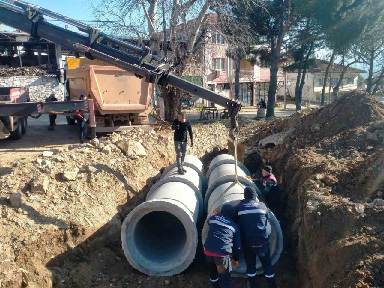 Aydın’ın Karacasu ilçesinde devam eden alt yapı çalışmaları kapsamında bölgeye getirilen beton büzler yer altına indirildi.