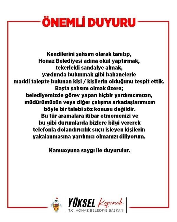 Kendilerini Honaz Belediye Başkanı Yüksel Kepenek ve belediye personeli gibi göstererek vatandaşlardan yardım parası isteyen dolandırıcılara karşı Başkan Kepenek uyarıda bulundu. Başkan Kepenek sosyal medyadan yaptığı paylaşımda, “Kendilerini şahsım olarak tanıtıp, Honaz Belediyesi adına okul yaptırmak, tekerlekli sandalye almak, yardımda bulunmak gibi bahanelerle maddi talepte bulunan kişi ve kişilerin olduğunu tespit ettik. Başta şahsim olmak üzere; belediyemizde görev yapan hiçbir yardımcımızın, müdürümüzün veya diğer çalışma arkadaşlarımızın böyle bir talebi söz konusu değildir. Bu tür aramalara itibar etmemenizi ve bu gibi durumlarda bizlere bilgi vererek telefonla dolandırıcılık suçu işleyen kişilerin yakalanmasına yardımcı olmanızı diliyorum” ifadelerini kullanarak vatandaşları uyardı.