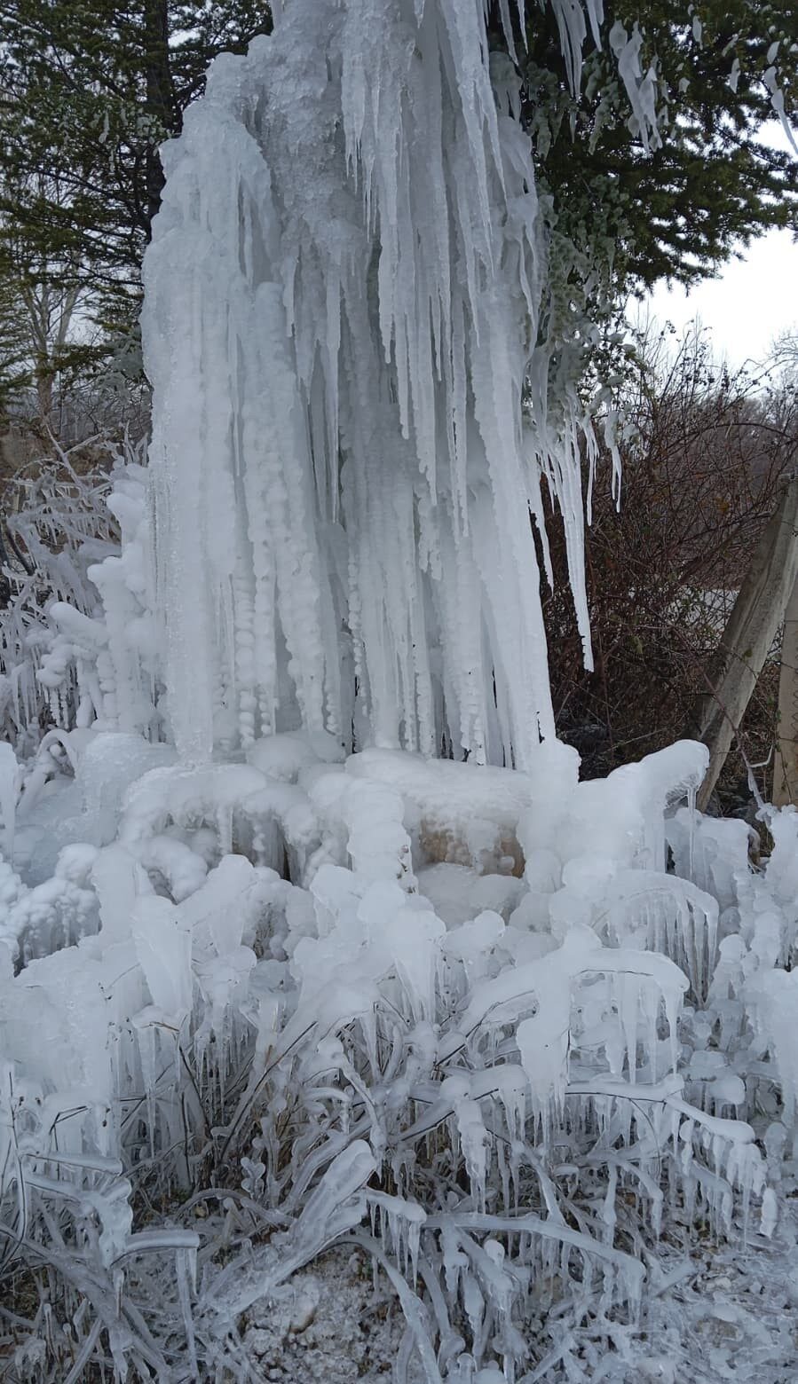 Bir vatandaşın cep telefonu ile kaydettiği görüntülerde, ağaç dallarından sarkan buz sarkıtlarının donmuş bir şelaleyi andırdığı görüldü.