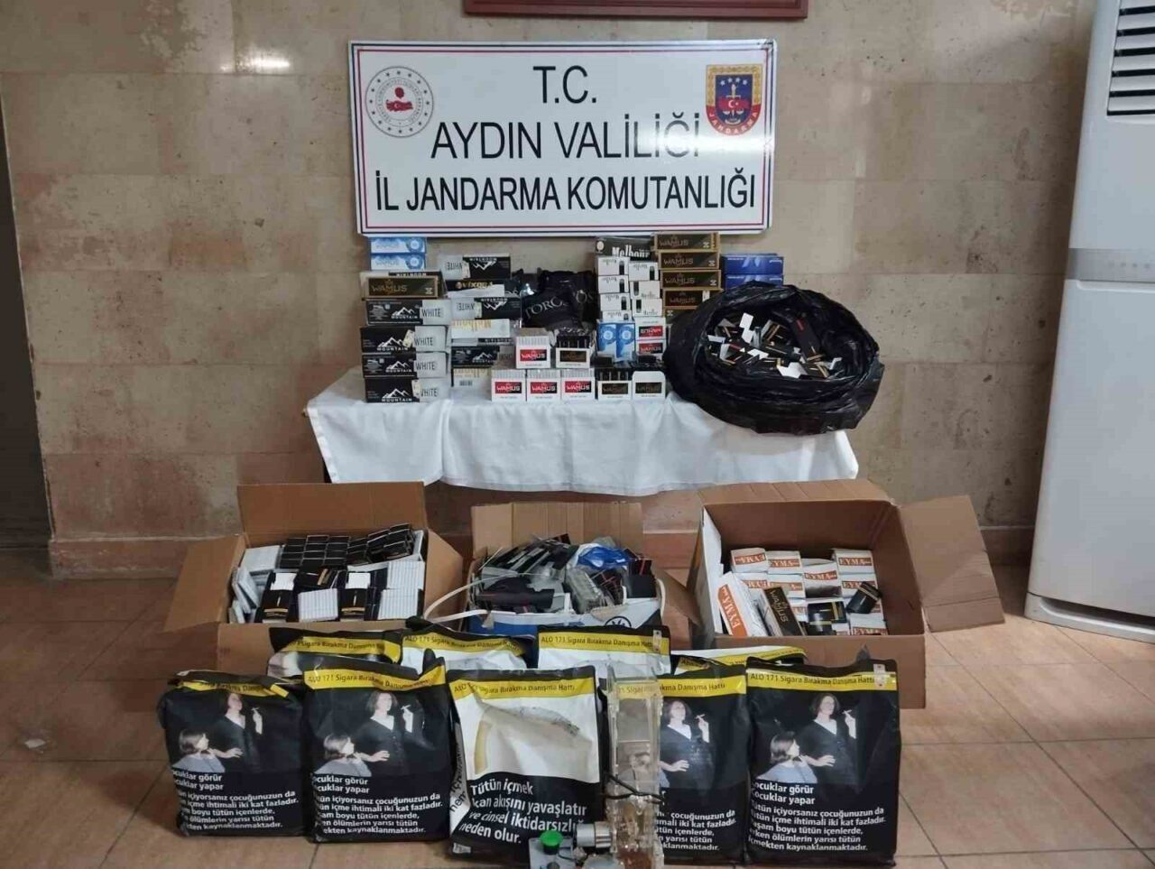 Aydın İl Jandarma Komutanlığı KOM Şube Müdürlüğü ve Germencik İlçe Jandarma Komutanlığınca sigara kaçakçılığına yönelik koordineli çalışma gerçekleştirildi. Edinilen bilgiye göre ekipler, Germencik ilçesinde G.T. isimli şüpheli şahsın ikameti ve iş yerine baskın düzenledi. Yapılan aramalar sonucunda 5 kilo açık kıyılmış tütün, 10 kilo paketlenmiş bandrolsüz tütün, 40 bin adet boş makaron, 5 bin 500 adet dolu makaron, 4 bin 500 adet boş sigara kutusu, 3 bin adet boş şeffaf sigara paketi, 12 bin adet makaron filtresi, 1 adet elektrikli sigara sarma makinası ele geçirildi. Yakalanarak gözaltına alınan şüpheli şahıs ile ilgili başlatılan adli ve idari süreç devam ediyor.