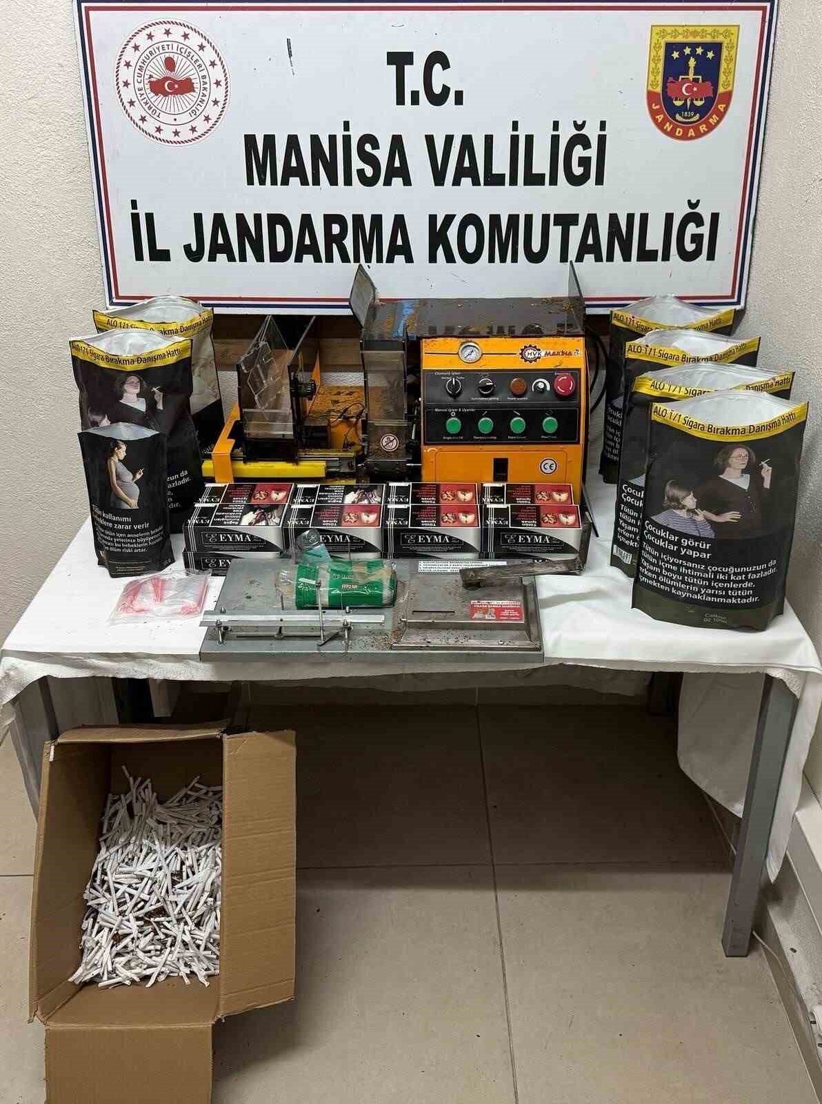 Manisa İl Jandarma Komutanlığı İstihbarat Şube Müdürlüğünce yapılan çalışmalar neticesinde, Akhisar ilçesi Medar Mahallesinde Z.T. (51/E) isimli şahsın iş yerinde KOM Şube Müdürlüğü ve Akhisar İlçe Jandarma Komutanlığı ekiplerince yapılan aramada, 1 adet elektronik sigara sarma makinası, 1 adet manuel sigara sarma makinası 8 bin 260 gram tütün, 10 bin 200 adet boş makaron, 1.280 adet dolu makaron ele geçirildi. Şüpheli şahıs hakkında adli tahkikata başlandığı açıklandı.