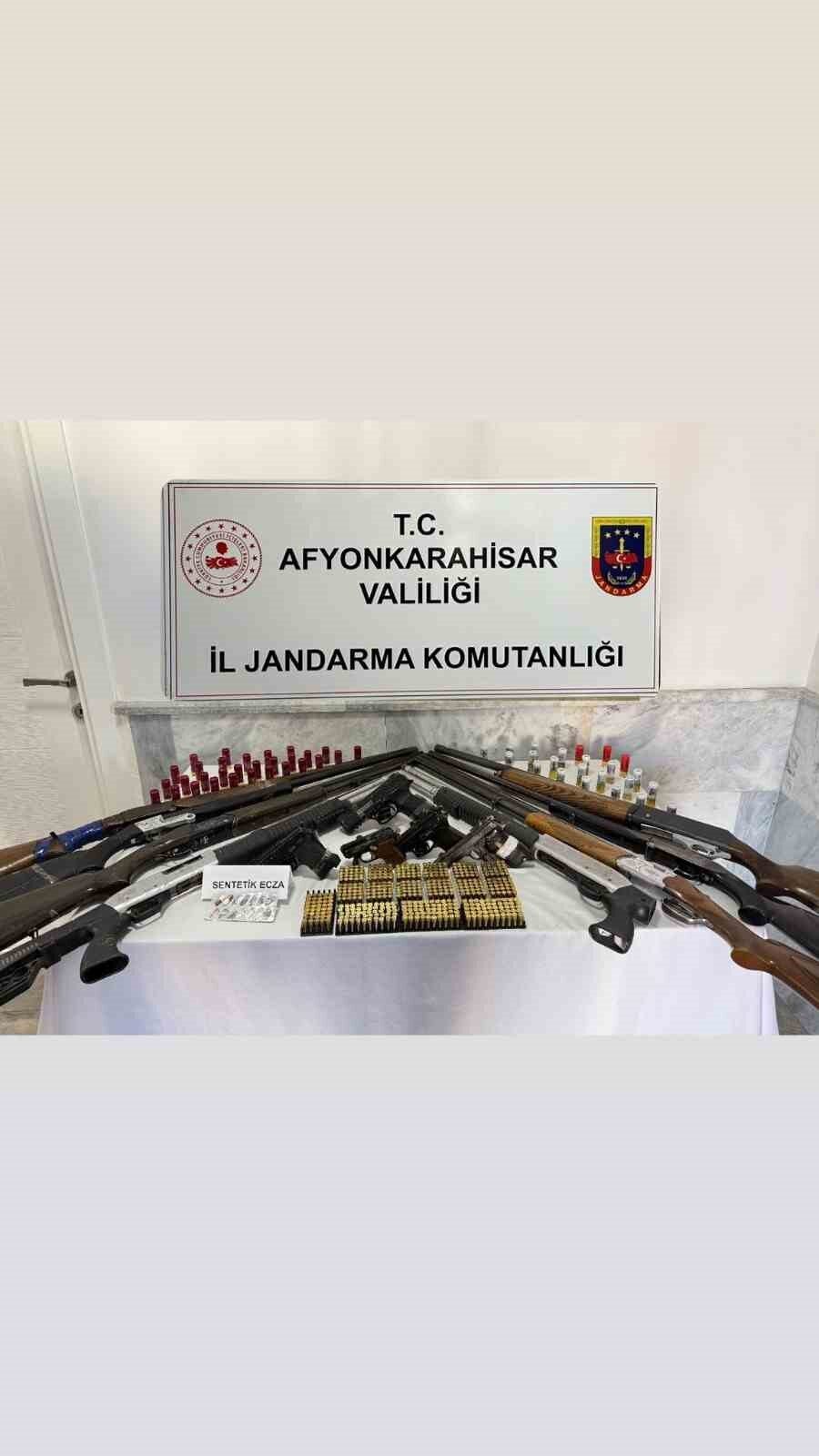 Edinilen bilgilere göre, Afyonkarahisar İl Jandarma Komutanlığı ekipleri kent merkezi, Salar, Nuribey, Sarık, Belkaracaören belde ve köylerinde evlerinde ruhsatsız silah bulundurdukları yönünde bilgi aldı. Ardından belirtilen bölgelerde operasyon yapan ekipler E.K., H.D., K.Y., H.F., S.B. ve A.K. isimli şahısların evlerine baskın düzenledi. Baskında yapılan aramalarda 8 adet av tüfeği, tabanca, 4 adet kurusıkı tabanca, tabanca şarjörleri, 500’e yakın mermi ve 2 adet galara sentetik ecza hapı ele geçirildi. Gözaltına alınan şahıslara olayla ilgili toplamda 48 bin 16 TL idari para cezası uygulandığı bildirildi.
