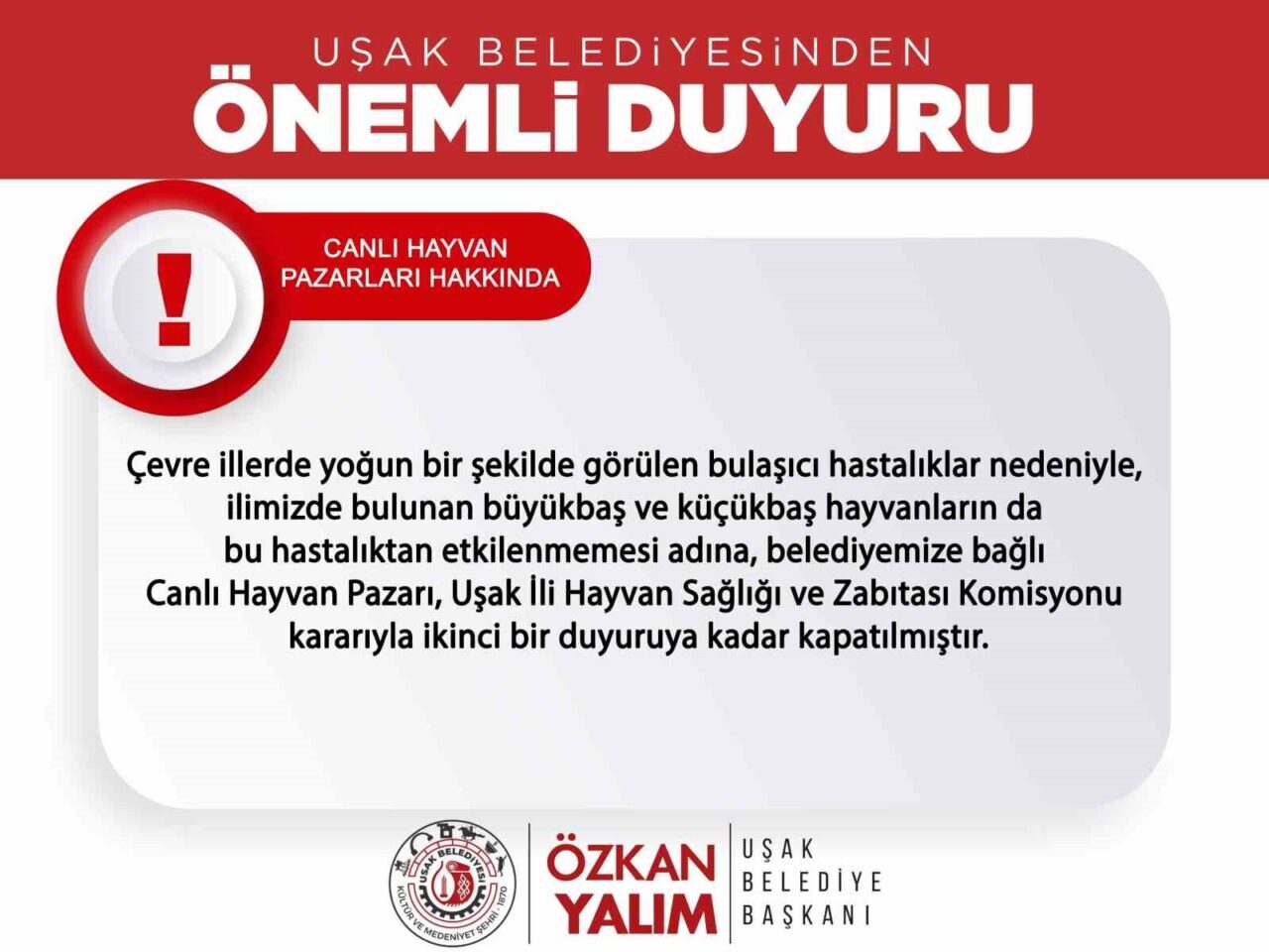 Uşak Belediyesi’nin sosyal medya hesabından yapılan paylaşımda ise; “Çevre illerde yoğun bir şekilde görülen bulaşıcı hastalıklar nedeniyle, ilimizde bulunan büyükbaş ve küçükbaş hayvanların da bu hastalıktan etkilenmemesi adına, belediyemize bağlı Canlı Hayvan Pazarı, Uşak İli Hayvan Sağlığı ve Zabıtası Komisyonu kararıyla ikinci bir duyuruya kadar kapatılmıştır.” ifadelerine yer verildi.
