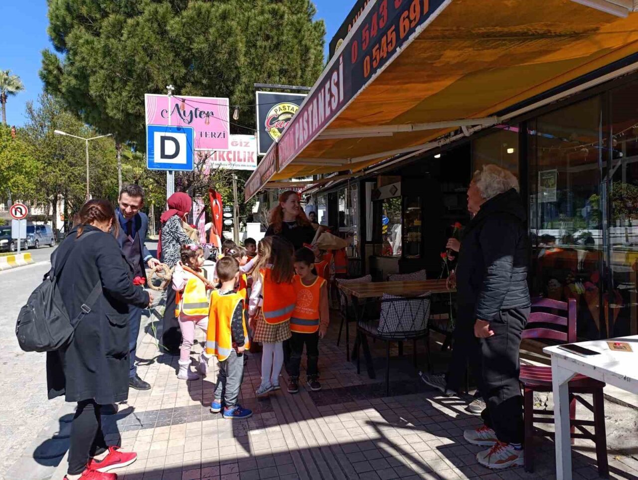 Muğla’nın Köyceğiz ilçesinde anaokulu öğrencileri, 8 Mart Dünya Kadınlar Günü dolayısıyla sokaktaki kadınlara çiçek dağıtarak günlerini kutladı.