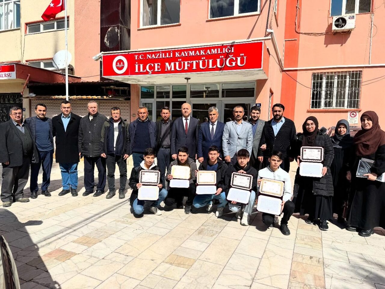 Nazilli İlçe Müftülüğü’ne bağlı Hafızlık Kur’an Kurslarında hafızlık eğitimini tamamlayan öğrencilere belgeleri İlçe Müftüsü Hakan Türe tarafından takdim edildi.