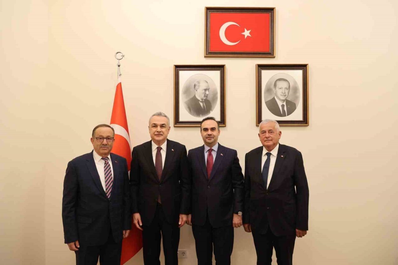 Aydın Ticaret Borsası Meclis Başkanı A. Bahri Erdel ve Yönetim Kurulu Başkan Yardımcısı Cengiz Ülgen, Aydın Milletvekili Mustafa Savaş ile birlikte Sanayi ve Teknoloji Bakanı Mehmet Fatih Kacır’ı makamında ziyaret etti.