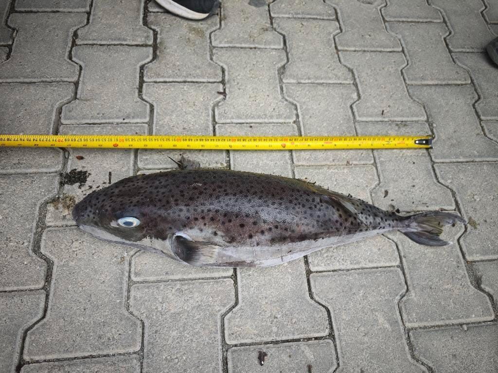 Muğla’nın Datça ilçesinde 68 santimetre boyundaki balon balığı, karaya vurmuş halde bulundu.