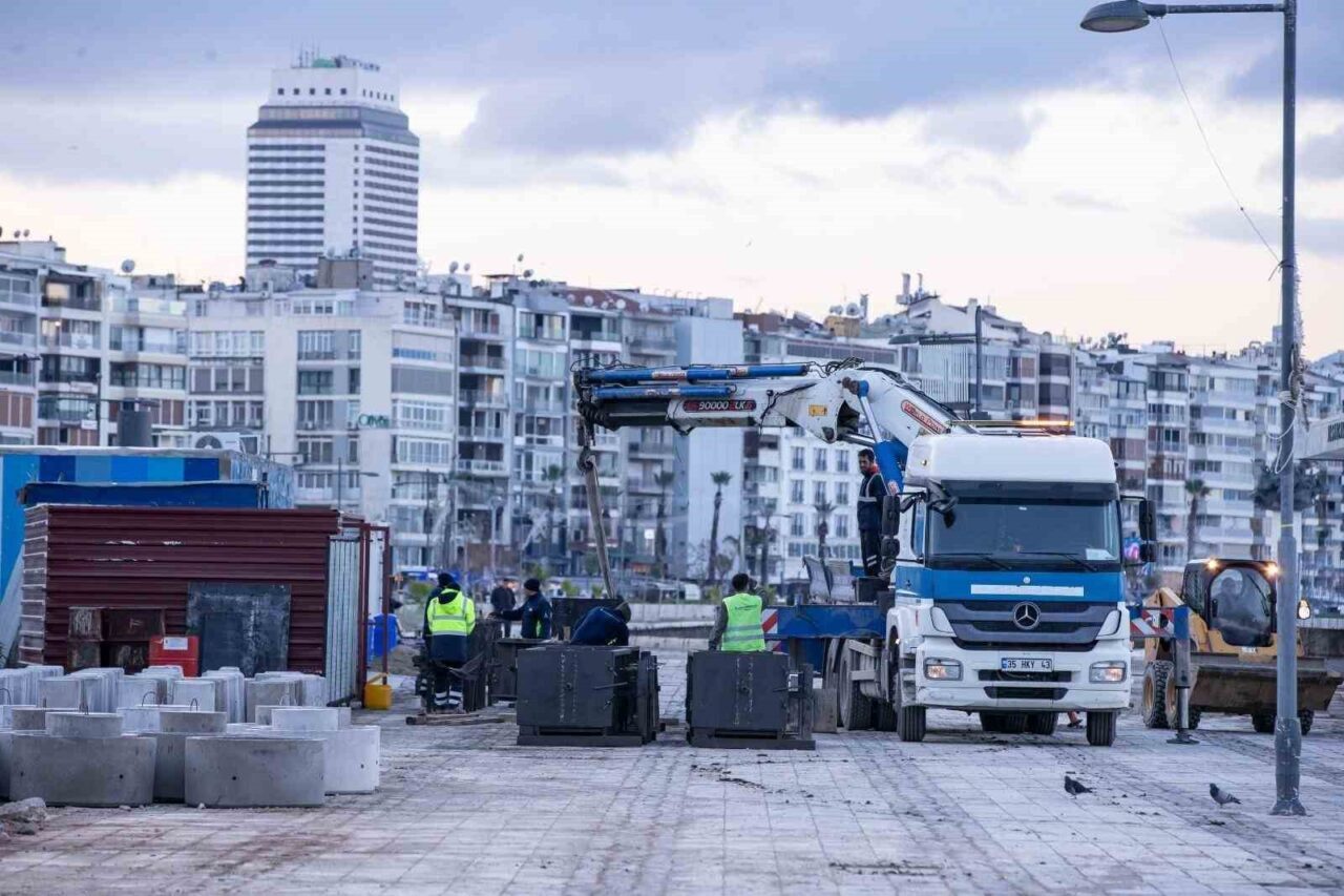İzmir Büyükşehir Belediyesi, Kordon’u baştan aşağı düzenleyecek çalışmalarda sona geldi. Çalışmalar kapsamında deniz taşkınlarını önleyecek geçici fırtına duvarı yapımı tamamlanırken Kordon’un bakım, onarım ve peyzaj çalışmaları tüm hızıyla devam ediyor. Çalışmalar kapsamında, Kordon boyunca, zemin yenilemesi, kent mobilyaları ve sosyal donatı malzemelerinin, çocuk oyun alanlarının montajı yapılacak. Park ve Bahçeler Dairesi Başkanlığı tarafından fırtına duvarı ve çevresinde çok sayıda bitki ve ağaç dikimiyle alan yemyeşil bir görünüme kavuşturulacak. Çalışmaların tamamlanmasıyla Kordon, baştan sona yenilenerek uzun yılların oluşturduğu yorgun yapısından kurtulmuş olacak.