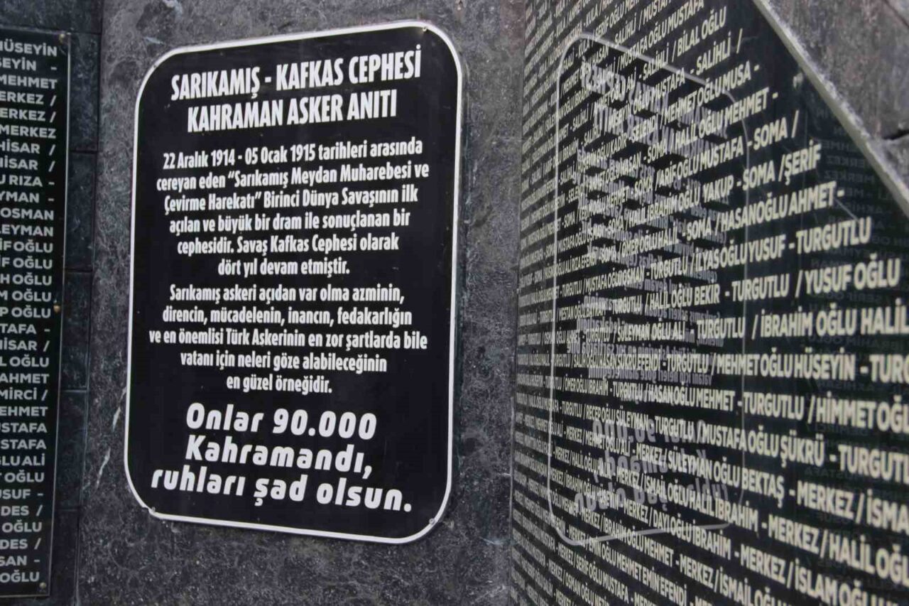 Manisa’nın Yunusemre ilçesi Laleli Yürüyüş Parkında bulunan Sarıkamış-Kafkas Cephesi Kahraman Asker Anıtı önünde gerçekleştirilen program saygı duruşunda bulunulması ve İstiklal Marşı’nın okunmasıyla başladı. Sarıkamış Şehitleri Yaşatma ve Dayanışma Derneği Genel Başkan Yardımcısı Günay Pehlivan ve yönetim kurulu üyeleri tarafından anıta çelenk sunuldu.