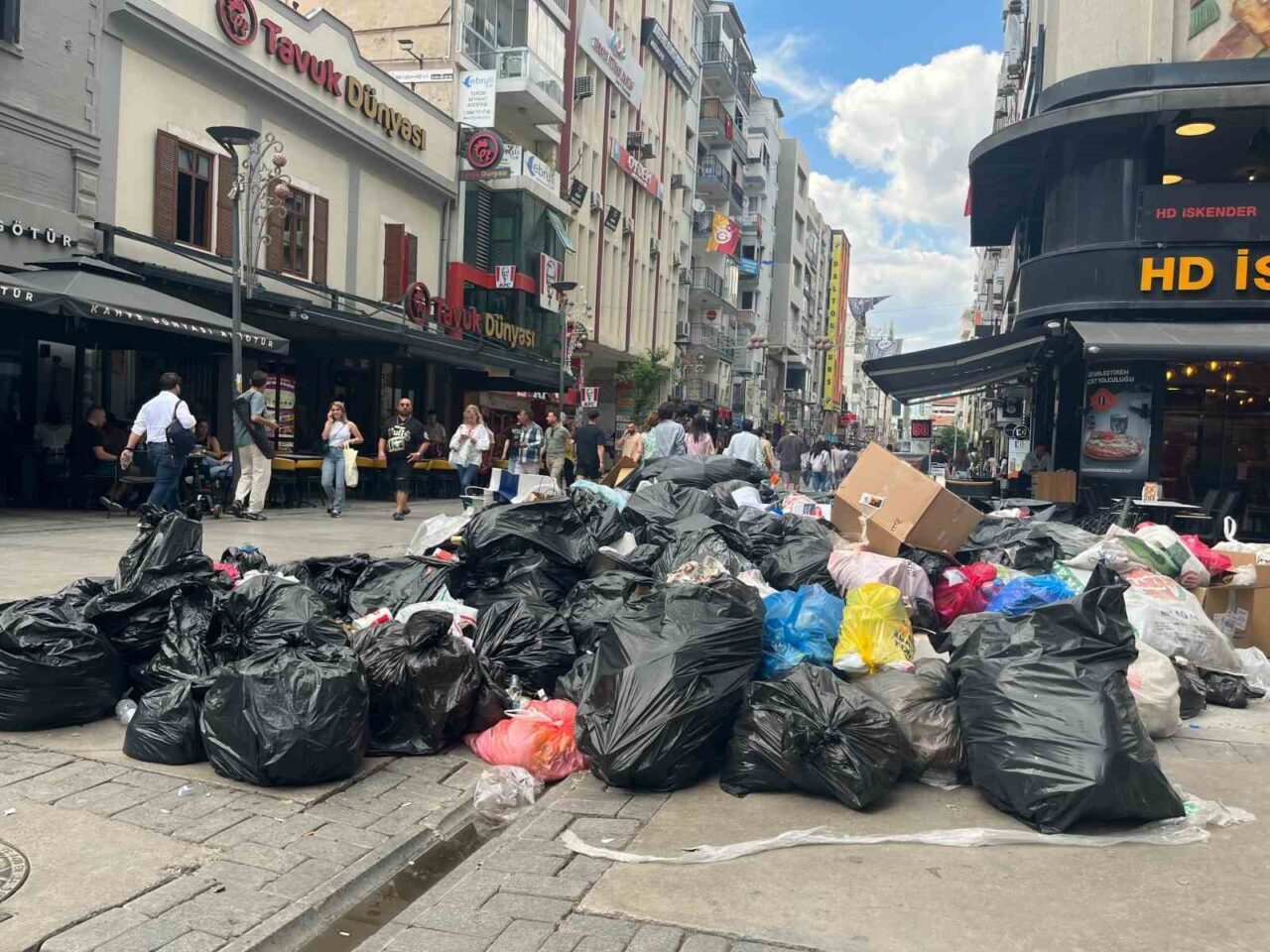 İzmir Büyükşehir Belediyesi’ne bağlı iştiraklerde çalışan işçilerin iş bırakma eylemi nedeniyle Alsancak, Kıbrıs Şehitleri Caddesi ve Kordon’da çöpler yollara taştı.