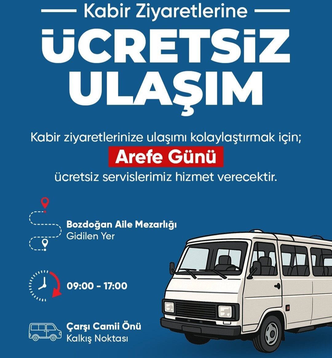 5 Haziran 2025 Perşembe günü, saat 09.00 ile 17.00 arasında, Çarşı Camii önünden kalkacak servis araçları ile vatandaşlar Bozdoğan Asri Mezarlığı’na ücretsiz bir şekilde ulaştırılacak. Bozdoğan Belediyesi tarafından organize edilen bu hizmet, özellikle yaşlı, engelli ve özel aracı bulunmayan vatandaşlar için büyük bir kolaylık sağlıyor.