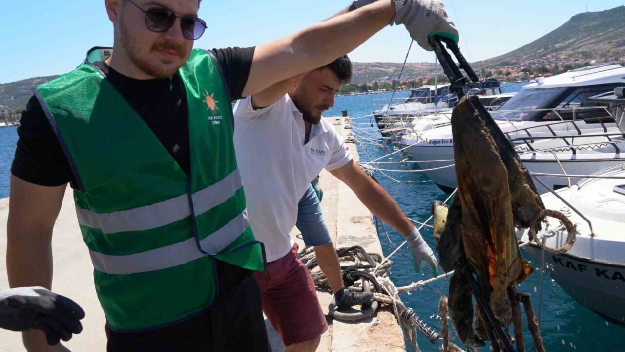 AK Parti İzmir Çevre, Şehir ve Kültür Başkanlığı tarafından, 5 Haziran Dünya Çevre Günü etkinlikleri kapsamında dalgıçlar eşliğinde eski Foça rıhtımında dip temizliği gerçekleştirilirken, denizden sandalyeler çıktı.