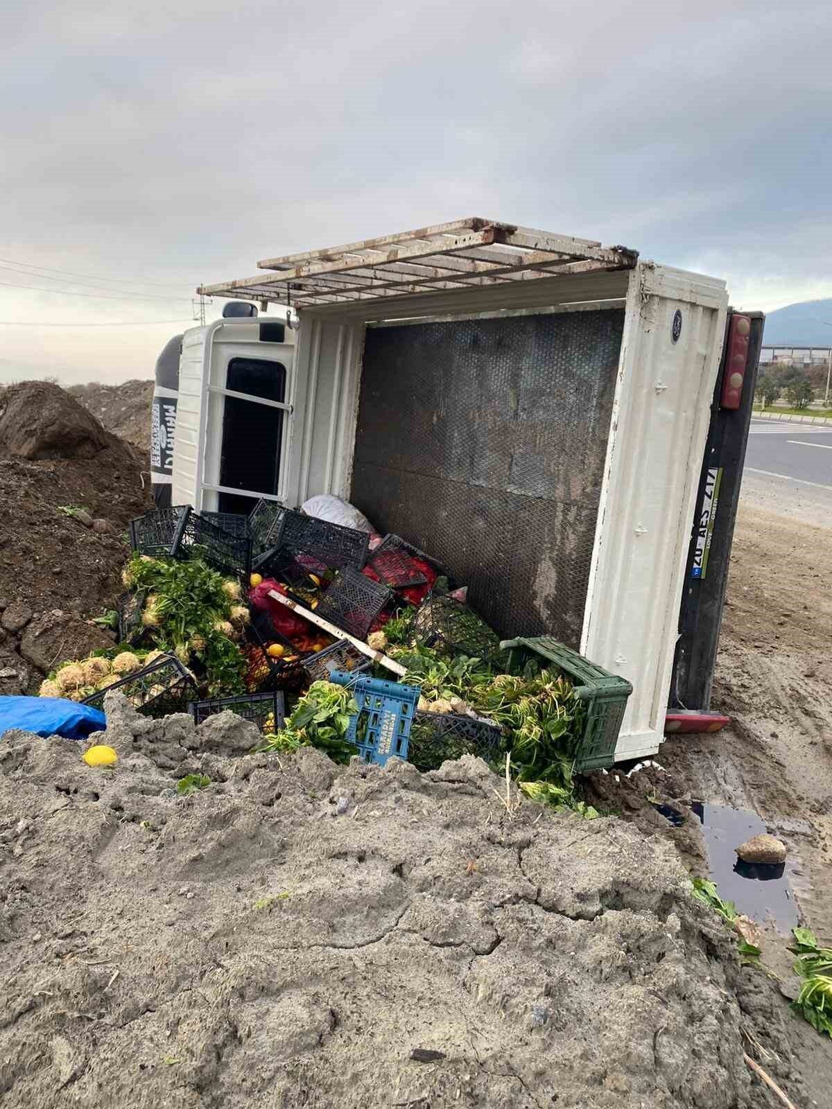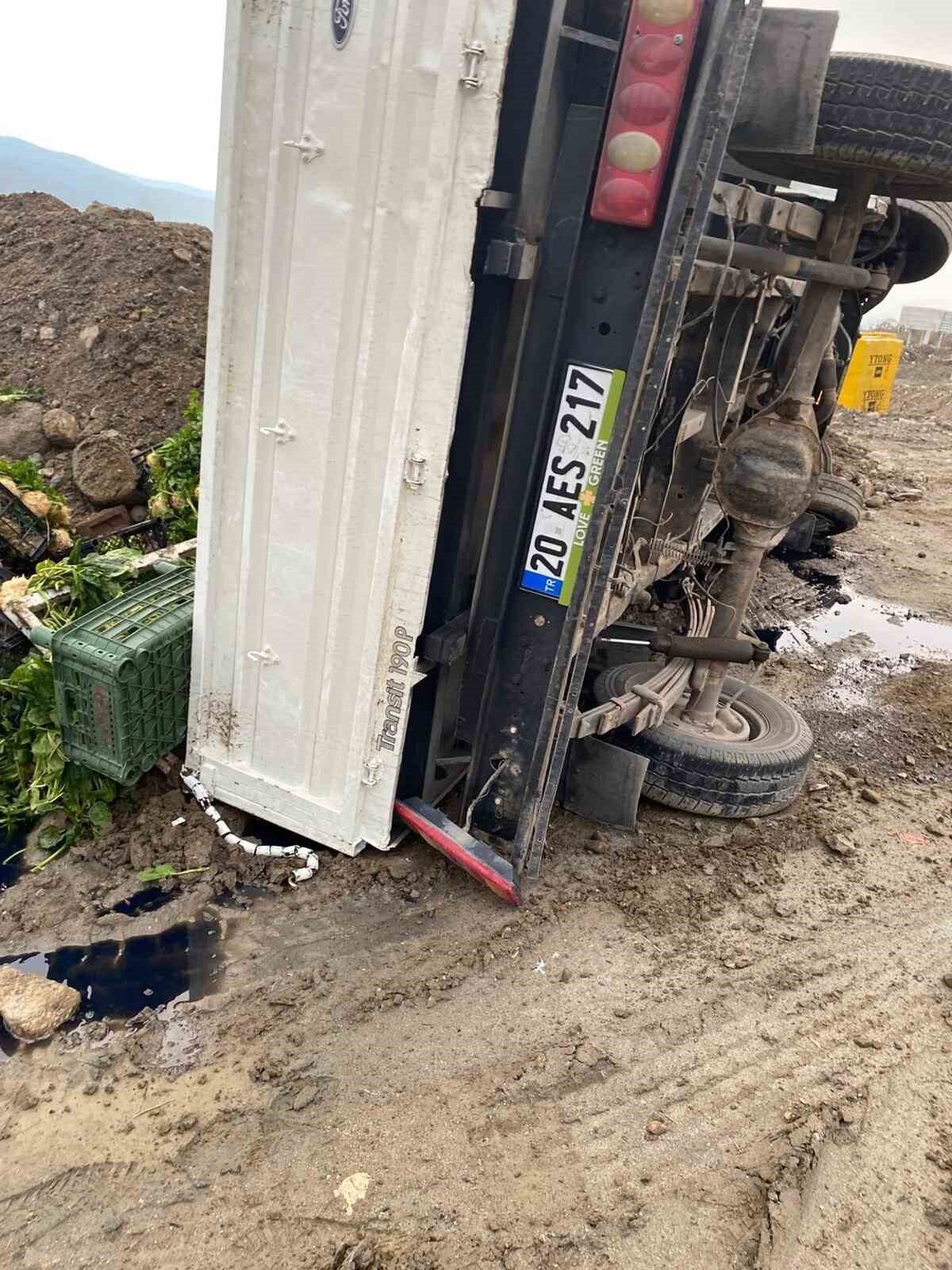 Edinilen bilgiye göre, Aydın’ın İncirliova ilçesindeki Acarlar Sebze Hali’nden yüklenen ürünleri taşıyan 20 AES 217 plakalı kamyonet, Buharkent Ortakçı Mahallesi Meryemoğlu mevkii Aydın-Denizli karayolu üzerinde lastiğinin patlaması sonucu yoldan çıkarak devrildi. Kaza ihbarı üzerine bölgeye polis ve sağlık ekipleri sevk edildi. Araç içerisindekiler kazayı hafif şekilde atlatırken, kazayla ilgili soruşturma başlatıldı.