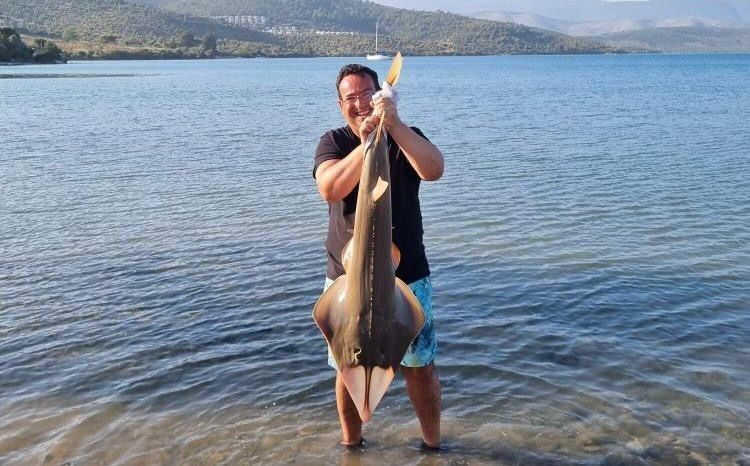 Milas’a bağlı Kıyıkışlacık Mahallesi açıklarında eşiyle birlikte balık tutan bir vatandaşın oltasına, türü koruma altındaki kemane balığı takıldı. Balığı yakalayıp hatıra fotoğrafı çektiren çiftin, duyarlı davranarak balığı yeniden denize bıraktığı öğrenildi.