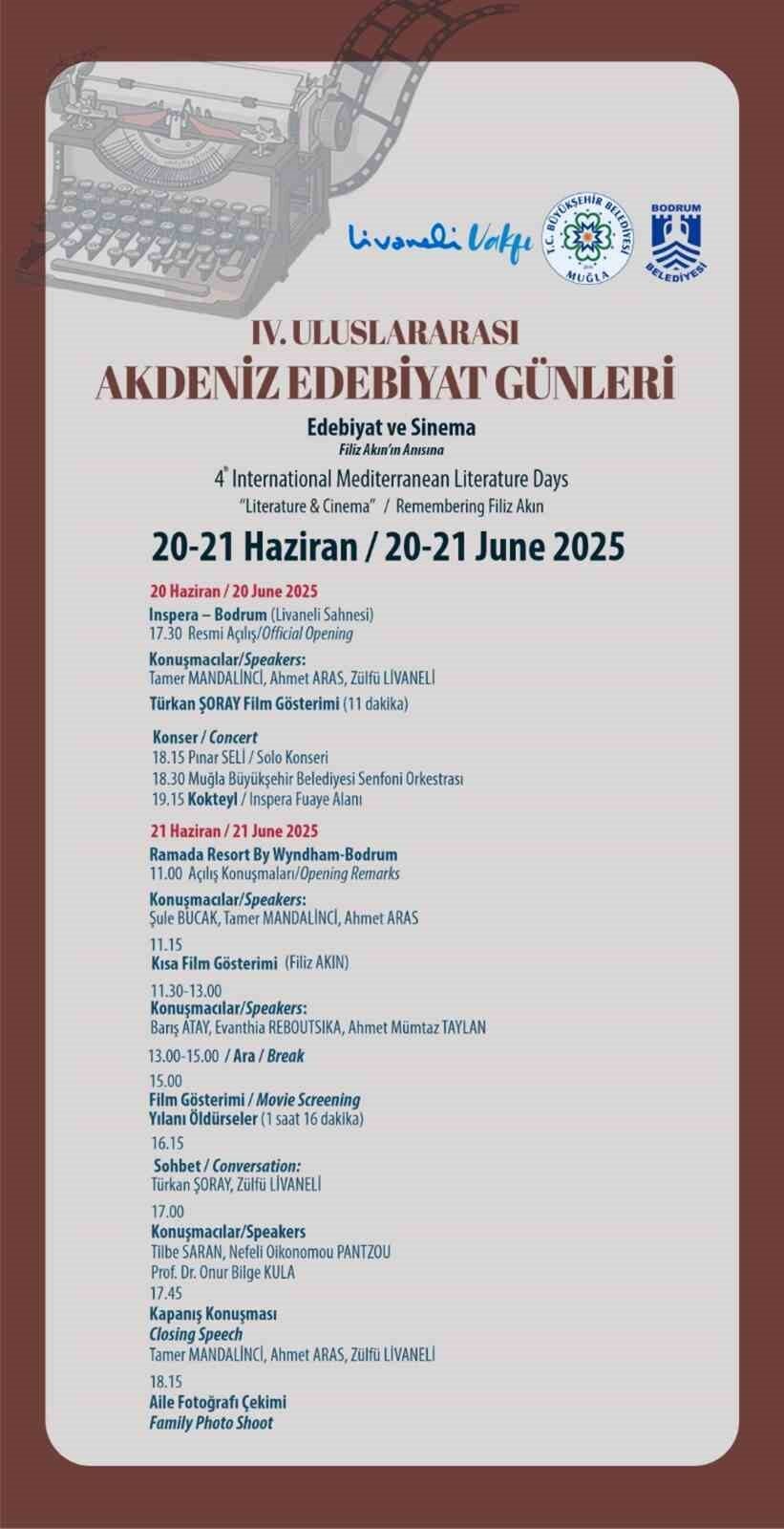 Muğla Büyükşehir Belediyesi, Bodrum Belediyesi ve Livaneli Vakfı iş birliğiyle bu yıl dördüncüsü düzenlenen Uluslararası Akdeniz Edebiyat Günleri, 20-21 Haziran tarihlerinde Bodrum’da edebiyat ve sanat dünyasını bir araya getirecek. Bu yıl etkinlik, 82 yaşında hayatını kaybeden usta oyuncu Filiz Akın’ın anısına düzenleniyor.