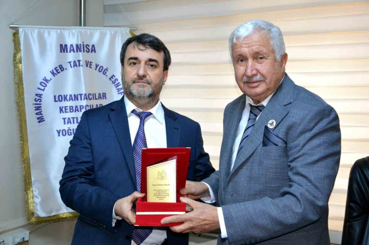 Manisa’da 58 yıldır aşçılık yapan ve 2005 yılında Manisa Lokantacılar, Kebapçılar, Tatlıcılar ve Yoğurtçular Esnaf Odası Başkanlığına seçildikten sonra 19 yıldır kesintisiz bu görevini sürdüren Mehmet Akgül görevi gençlere bırakmak adına oda başkanlığını yine kendi yönetiminde yer alan Şafak Yıldırım’a devretti. Görev süresi dolmadan görevini devreden Akgül’e yeni başkan Şafak Yıldırım tarafından odaya ve mesleğe sunduğu hizmetlerden dolayı teşekkür plaketi takdim edildi.