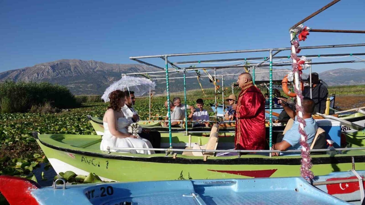 Türkiye’nin en büyük nilüfer çiçeği tarlasına ev sahipliği yapan Işıklı Gölü’nde ilk kez bir nikah teknede kıyıldı. Genç çift, nilüferler arasında göl üstünde dünyaevine girdi.
