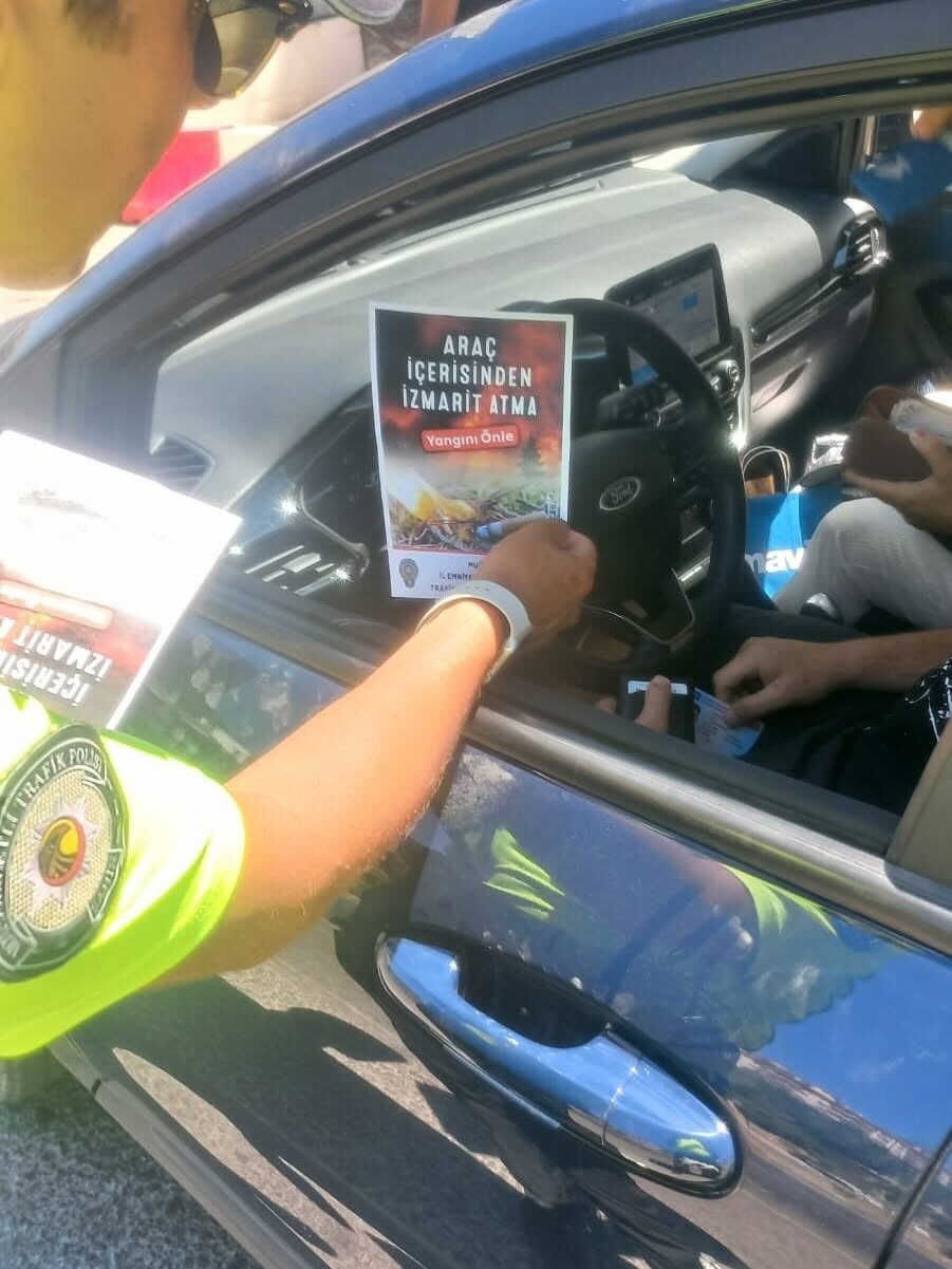 Trafik denetimlerinde görevli ekipler, özellikle kırsal ve ormanlık alanlardan geçen yollarda sürücü ve yolculara yönelik bilgilendirme broşürleri dağıtarak, yangınlara karşı dikkatli olunması konusunda uyarılarda bulunuyor.
