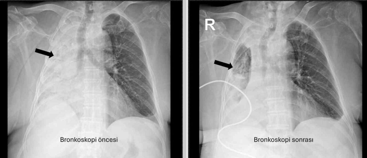 Denizli’de yaşayan ve emekli öğretmen olan 78 yaşındaki felçli kadın son zamanlarda sık sık akciğer enfeksiyonu nedeniyle hastaneye gidiyordu. 1 ay önce gittiği hastanede bronkoskopi yapılmasına rağmen sorun saptanmadığı öğrenildi. Yaşlı kadının son gittiği hastanede sağ akciğerinin tamamen kapandığının tespit edilmesi üzerine Pamukkale Üniversitesi Hastanesine başvuruldu. PAÜ Hastaneleri Göğüs Hastalıkları Anabilim Dalı Öğr. Üyesi Prof. Dr. Göksel Altınışık Ergur, tarafından yapılan tetkiklerde sağ akciğere giden hava yolunun bütünüyle kapalı olduğu görüldü. hastaya acil bronkoskopi planlanıp hemen işlemin gerçekleştirildiğini söyleyen Prof. Dr. Altınışık Ergur, “Fleksibl (esnek, eğilip bükülebilir) bronkoskop ile hava yolları incelenirken çok yoğun ve koyu sekresyon olduğu, bunun iyice temizlenmesi sonucunda ancak hava yollarının incelenebileceği görüldü. Aspiratör (içerideki salgıları emmeye yarayan bir cihaz) sayesinde hava yollarına steril sıvı verilip emilerek bu temizlik yapıldı. Sonrasında sağ akciğere giden hava yolunda sarı bir nesne olduğu görüldü. Bu hâliyle yabancı cisim olduğu anlaşıldığı gibi bunun mısır tanesine benzerliği de açıktı. Yabancı cismi çıkarma işlemi genel anestezi altında, rijit bronkoskop ile yapılmak üzere planlanabilirdi; çünkü bu durumun tedavisi yabancı cismin oradan, ek sorun oluşturmaksızın çıkarmaktı. Ancak, genel anestezi altındaki bir işlem için hastanın genel durumu bozuk olduğundan, özellikle ek hastalıkları ve enfeksiyon varlığı ile işlem riski artacağından hastadaki cismin fark edildiği sırada çıkarılmasına şans vermek daha uygun görüldü. Hava yolu içindeki sıvıları emen aspiratörün gücünü kullanılarak cismin çıkarılması mümkündü. Bronkoskobun ucu, sarı cismin gövdesine dayanıp aspiratör ile emme sayesinde ikisi birbirine sımsıkı yapıştırıldı. Emme gücünün azaltılmamasına dikkat ederek yabancı cisim ve bronkoskop, aynı zamanda hava yollarından dışarıya başarı ile çıkarıldı. İşlem sonrasında hasta yakınına mısır tanesi açısından tıbbi öykü yeniden sorulduğunda, hastamızın bundan beş ay önce yediği pizzanın üzerinde mısır taneleri olduğu öğrenildi. O sırada ani bir yakınma ortaya çıkmadığı için böyle bir ihtimal akla gelmemişti. Düşkün hastalar taneli gıdalar yerken, bu durumun fark edilmeden de gelişebileceğini göstermesi açısından önemli olan bu tablo, hastaların bir dedektif titizliği ile değerlendirilmesi gerekliliğini bir kez daha ortaya koymaktadır” dedi.