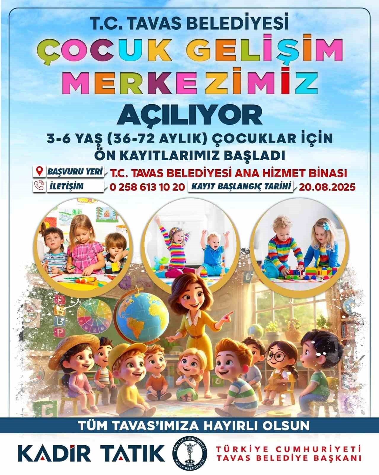Çalışan ailelerin çocuklarını güvenli ortama emanet etmeleri amacıyla Tavas Belediyesi tarafından Çocuk Gelişim Merkezi açılıyor. Tavas Çocuk Gelişim Merkezi çocukların güvenli, modern ve sevgi dolu bir ortamda gelişimlerini desteklemek amacıyla; sanat ve yaratıcılık atölyeleri, erken çocukluk eğitim programları, oyun, spor ve hareket etkinlikleri, müzik ve ritim çalışmaları gibi zengin içerikli eğitim programları ile hizmet verecek. Yakın zamanda hizmet vermeye başlayacak olan Gelişim Merkezi için 3 ile 6 yaş arası çocuklar için ön kayır 20 Ağustos 2025 Çarşamba günü itibariyle başladı. Kayıt yaptırmak isteyen vatandaşların Tavas Belediyesi Hizmet Binasındaki ilgili birime giderek başvuru yapmaları gerekiyor.