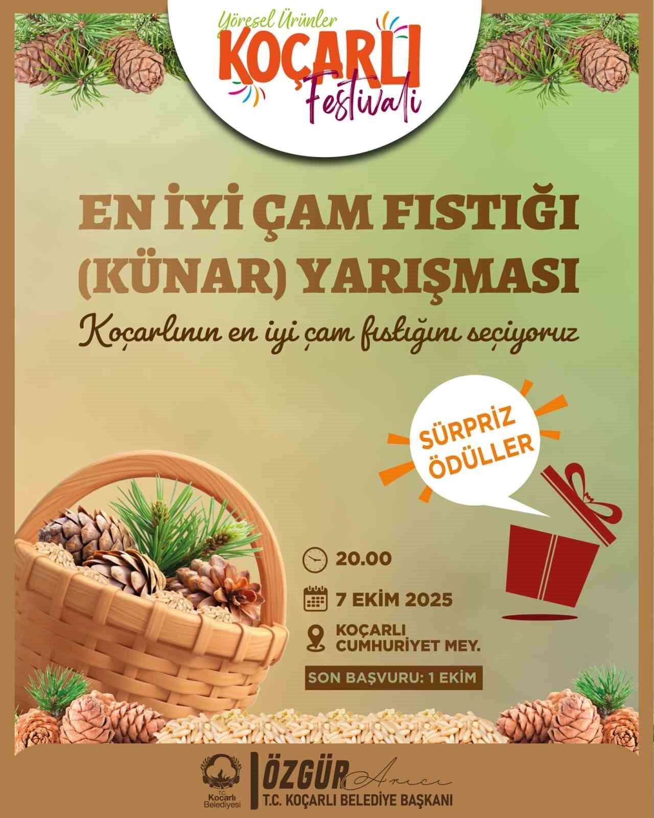 Aydın’ın Koçarlı ilçesinde düzenlenecek olan 15. Geleneksel Çam Fıstığı ve Yöresel Ürünleri Festivali kapsamında üreticiler arasında “En İyi Çam Fıstığı” yarışması yapılacak, dereceye girenler festivalin kapanış gününde açıklanacak.