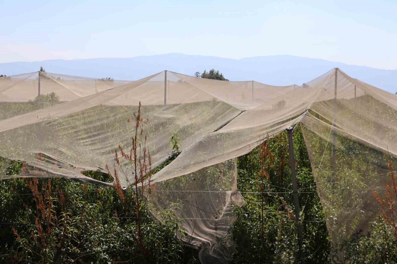 Aydın’da meyve üreticileri, ağaçların dolu ve kırağı gibi hava olaylarından etkilenmemesi amacıyla kullandıkları file sistemi, üreticilerin adeta doğal sigortası oldu.