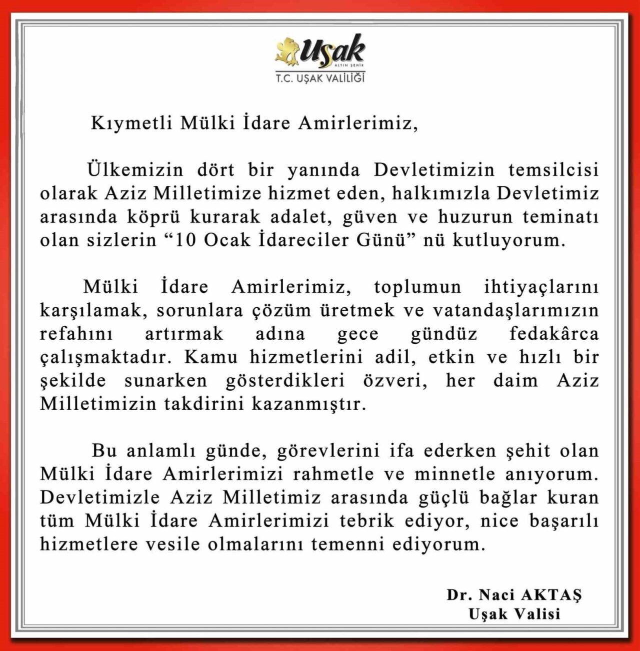Uşak Valisi Naci Aktaş, 10 Ocak İdareciler Günü dolayısıyla mesaj yayımladı. Uşak Valisi Naci Aktaş yayımlamış olduğu mesajda şu ifadelere yer verdi; “Ülkemizin dört bir yanında Devletimizin temsilcisi olarak Aziz Milletimize hizmet eden, halkımızla Devletimiz arasında köprü kurarak adalet, güven ve huzurun teminatı olan sizlerin 10 Ocak İdareciler Gününü kutluyorum. Mülki idare amirlerimiz, toplumun ihtiyaçlarını karşılamak, sorunlara çözüm üretmek ve vatandaşlarımızın refahını artırmak adına gece gündüz fedakârca çalışmaktadır. Kamu hizmetlerini adil, etkin ve hızlı bir şekilde sunarken gösterdikleri özveri, her daim aziz milletimizin takdirini kazanmıştır. Bu anlamlı günde, görevlerini ifa ederken şehit olan mülki idare amirlerimizi rahmetle ve minnetle anıyorum. Devletimizle Aziz Milletimiz arasında güçlü bağlar kuran tüm Mülki İdare Amirlerimizi tebrik ediyor, nice başarılı hizmetlere vesile olmalarını temenni ediyorum” ifadelerini kullandı.