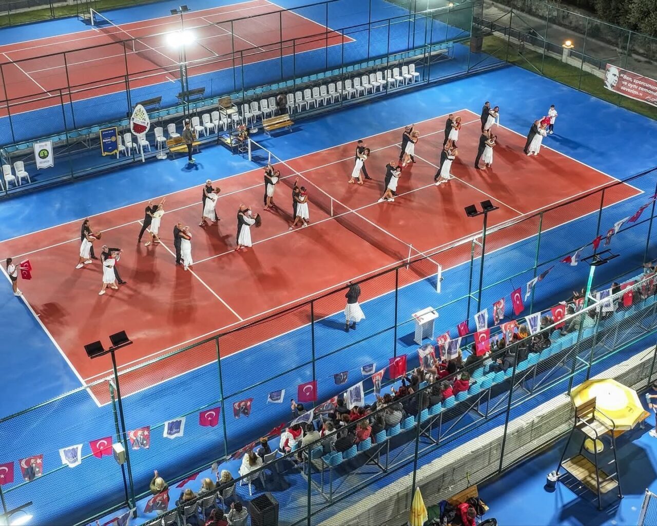 Gecede Kuşadası Kent Konseyi Cumhuriyet Sevdalıları Grubu, Atatürk’ün izinde hazırladıkları vals ve zeybek gösterileriyle sahne aldı. Cumhuriyet’in ruhunu en zarif biçimde yansıtan bu performans, izleyenlere unutulmaz anlar yaşattı. Ardından kortlara meşaleler eşliğinde çıkan tenisçiler, Cumhuriyet meşalesini simgeleyen görkemli bir kortej oluşturdu.