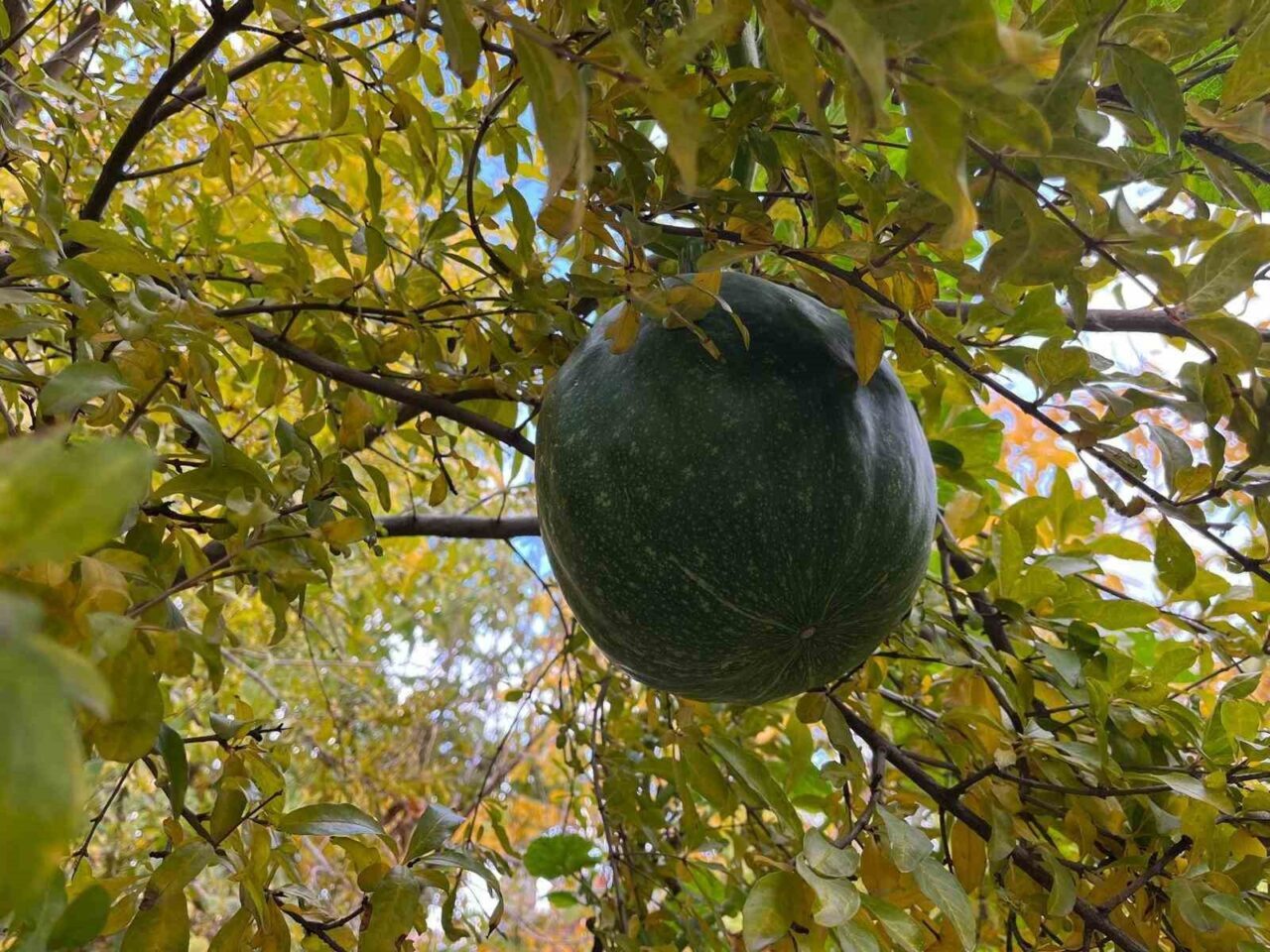 Denizli’nin Buldan ilçesi Turan Mahallesi’nde bahçeye ekilen kabak, nar ağacının tepesinde meyvelerini verdi. Bahar aylarında kabak çekirdeklerini toprağa gömdüğünü belirten Memnune Acıkara, “Kabaklar dökecek diye çok uzun süre bekledim. Sulamasını yaptım, yabani otlarını temizledim. Her tarafa kol attı ancak bir türlü meyveye dönmedi. Ben artık kış geldi bu zamandan sonra meyve vermez diye düşünüyordum. Daha sonra iki nar ağacımın tepesinde kabakların olduğunu gördüm. Toprakta yetişmeyen kabaklar nar ağaçlarında yetişti. Bugüne kadar böyle bir şey hiç görmedim duymadım. Emeklerim çok şükür boşa gitmedi” dedi.