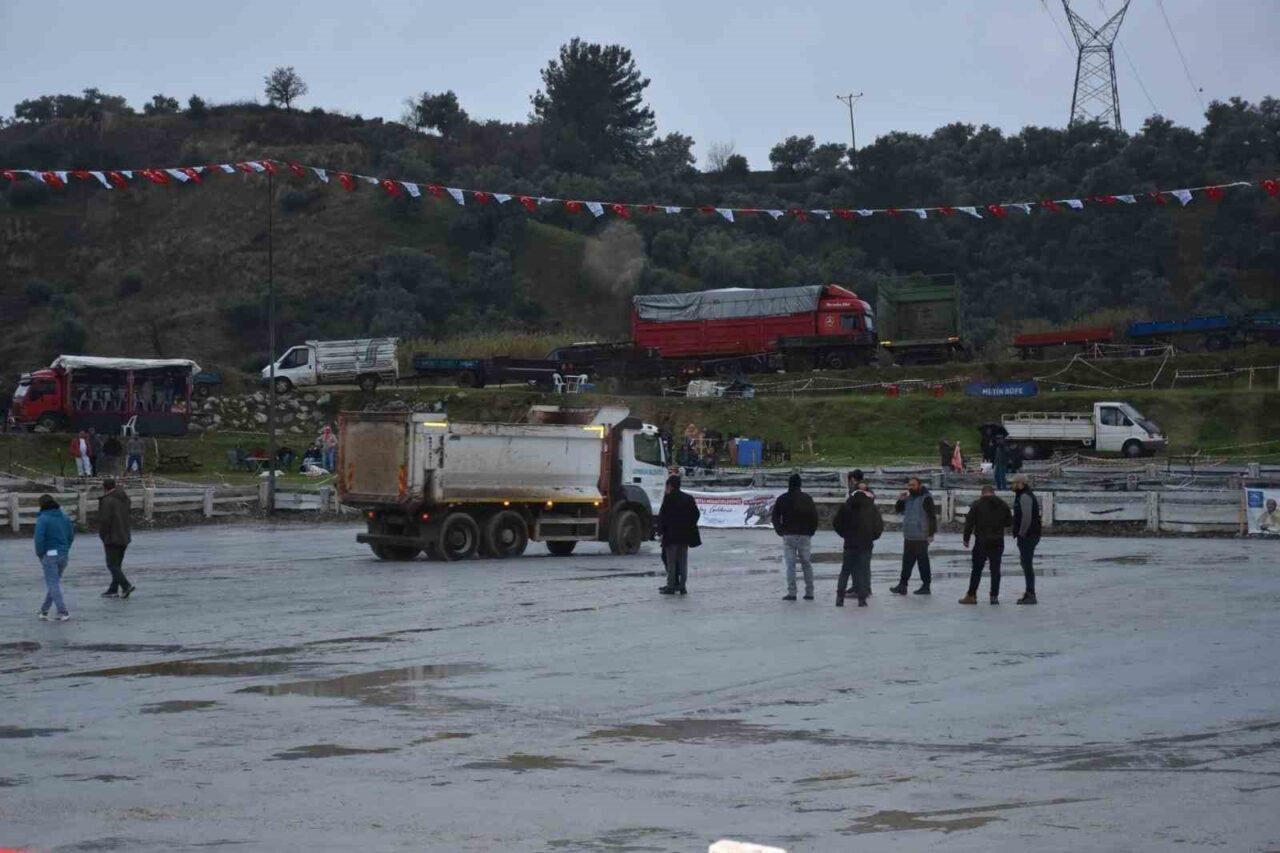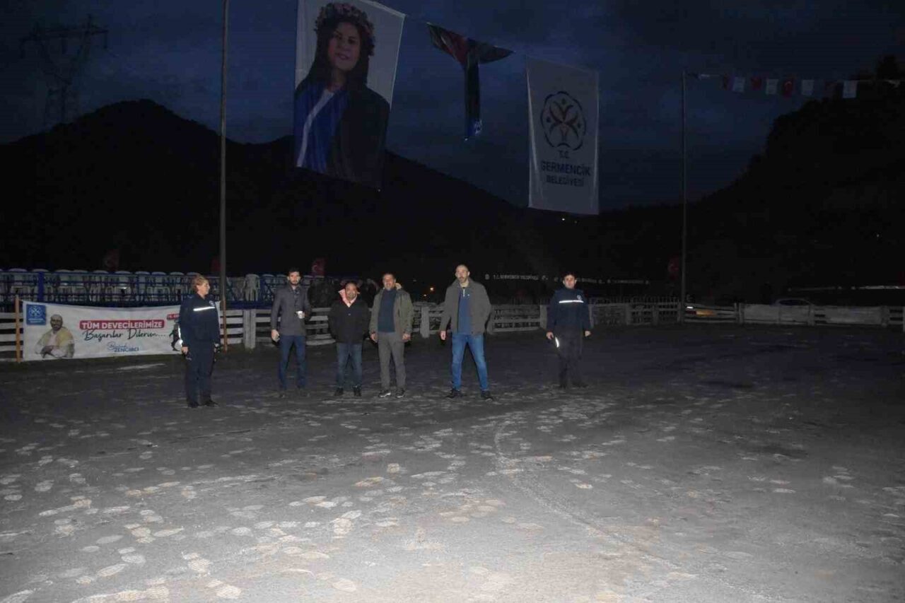 Uzun süredir hazırlıkları sürdürülen Germencik Deve Güreşi Festivali için, Çanakkale’den Antalya’ya, Balıkesir’den Denizli’ye kadar devecilik kültürüün yaşatıldığı Ege ve Marmra illerinden tüm develer davet edildi. Dün Germencik ilçemerkezinde gerçekleştirilen deve güzellik yarışması ve şehir merkezindeki develi kortej yürüyüşünün ardından arenaya hazırlanan develer yağışlar nedeniyle güreştirilemedi. Sabahın işlk ışıkları ile birlikte aranada zemin kontrolü yapıldı. Germencik Belediye Başkanı Burak Zencirli başkanlığında değerlendirme yapan güreş komitesi yağış dolayısıyla güreşleri iptal etti.
