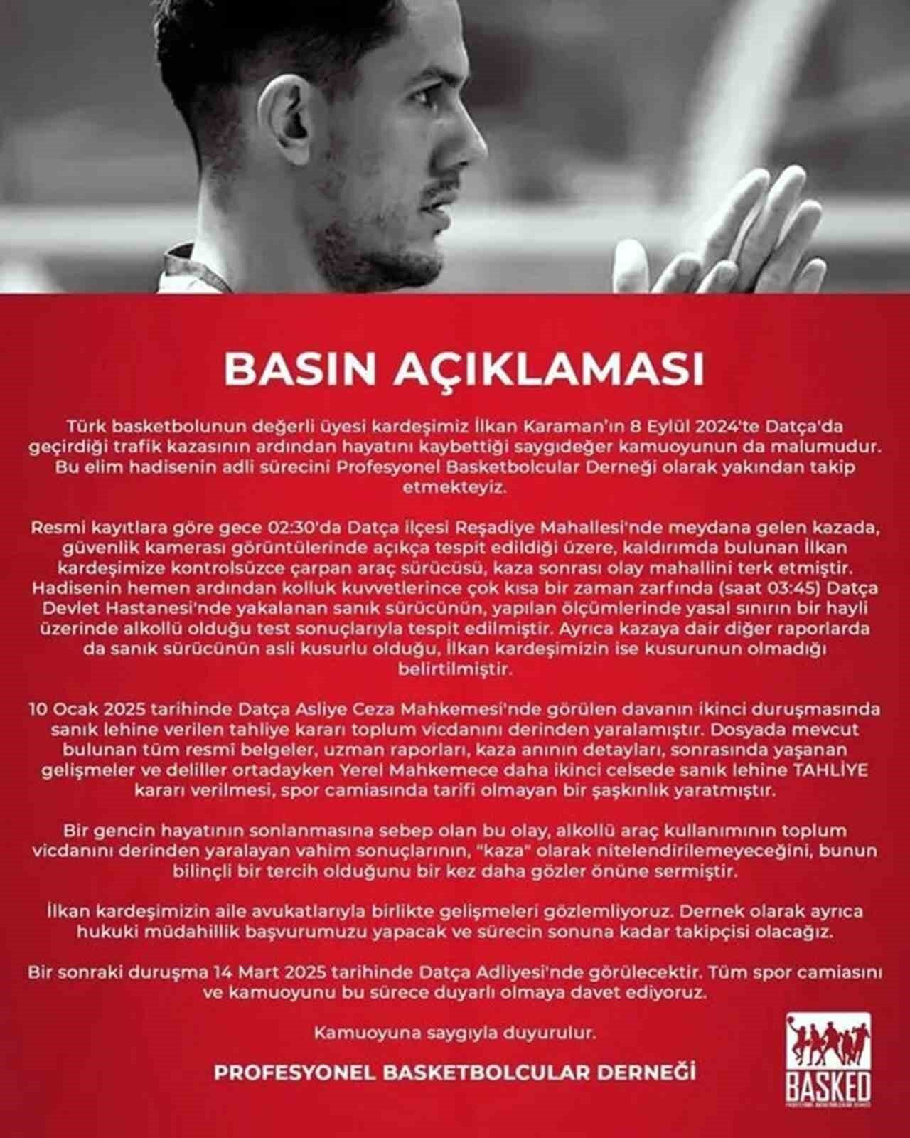 Eski milli basketbolcu İlkan Karaman’ın ölümüne neden olan sürücü Emre Ali Önder’in tahliyesine Profesyonel Basketbolcular Derneği de tepki gösterdi. Dernek tarafından yapılan açıklamada, “10 Ocak 2025 tarihinde Datça Asliye Ceza Mahkemesi’nde görülen davanın ikinci duruşmasında sanık lehine verilen tahliye kararı toplum vicdanını derinden yaralamıştır. Dosyada mevcut bulunan tüm resmi belgeler, uzman raporları, kaza anının detayları, sonrasında yaşanan gelişmeler ve deliller ortadayken, yerel mahkemece daha ikinci celsede sanık lehine tahliye kararı verilmesi spor cemaatinde tarifi olmayan bir şaşırmaya neden olmuştur. İlkan kardeşimizin aile avukatları ile birlikte gelişmeleri gözlemliyoruz. Dernek olarak ayrıca hukuki müdahillik başvurumuzu yapacak ve sürecin sonuna kadar takipçisi olacağız” denildi.