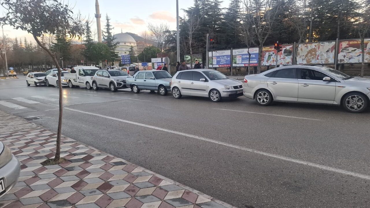 Isparta’da cadde üzerinde otomobilin ani fren yapması sonucu arkasında seyir halinde bulunan 7 otomobil birbirine girdi. Araçlarda maddi hasar oluşurken yaralanan olmadı.