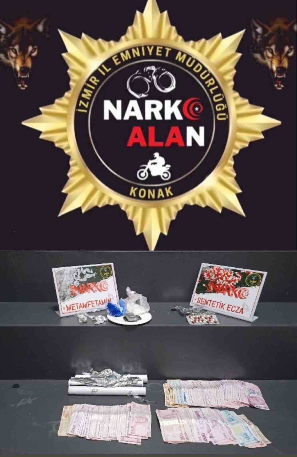 Konak İlçe Emniyet Müdürlüğü ekipleri, Yenişehir Mahallesi’nde şüphe üzerine durdurduğu bir kişinin üzerinden bir miktar metamfetamin maddesi ele geçirdi. Şüphelinin maddeyi temin ettiği adresi öğrenen ekipler, operasyon için savcılıktan izin aldı. Çok sayıda personelle adresi kuşatan polis ekipleri, adreste M.O. (45) ve C.B.’nin (19) uyuşturucu ticareti yaptığını, A.T. (25) ve H.O.’nun (53) uyuşturucu satın almaya geldiğini belirledi. Bu esnada polisleri fark eden M.O. (45), arka kapıdan kaçmaya çalıştığı esnada elinde bulunan uyuşturucu madde ve paraları kapının ardına attı. Polis tarafından kuşatılan adreste 4 şüpheli de gözaltına alındı.