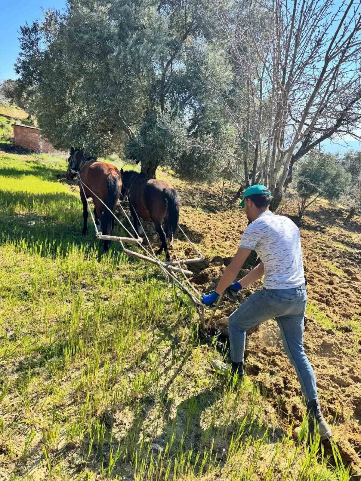 Aydın’ın Efeler ilçesinde engebeli arazide traktörün giremediği zeytinlikte üretici Hidayet Doğan, toprağı atlarla sürerek tarımsal üretimini sürdürüyor.
